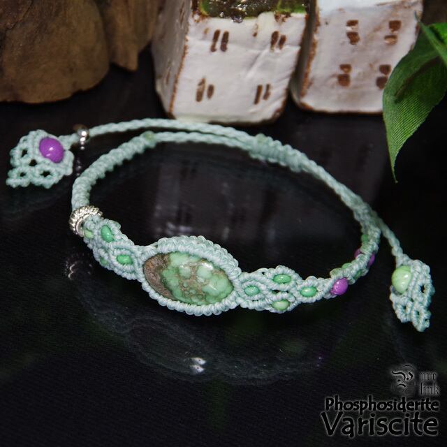 希少な兄弟姉妹石『バリサイト』と『フォスフォシデライト』が織りなす調和の美しさを、マクラメ編みで丁寧に編み込みました。