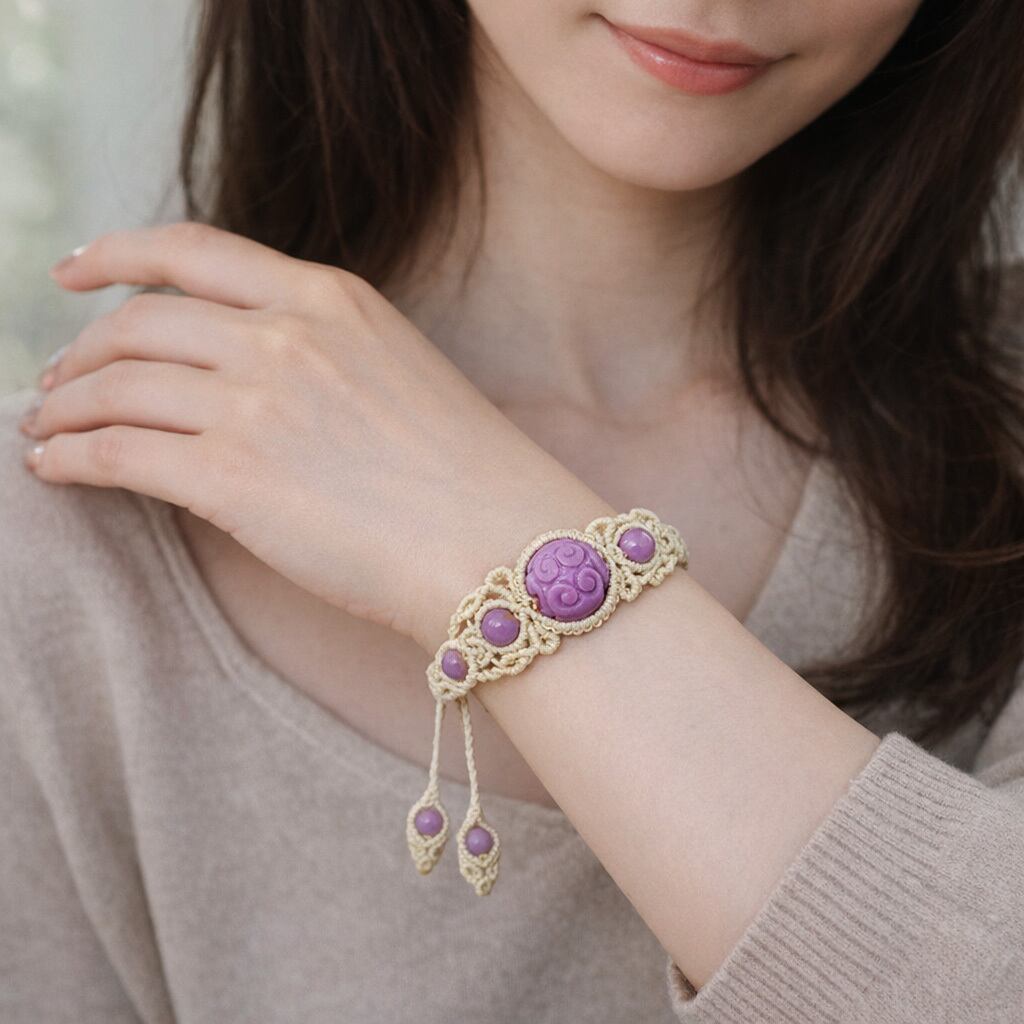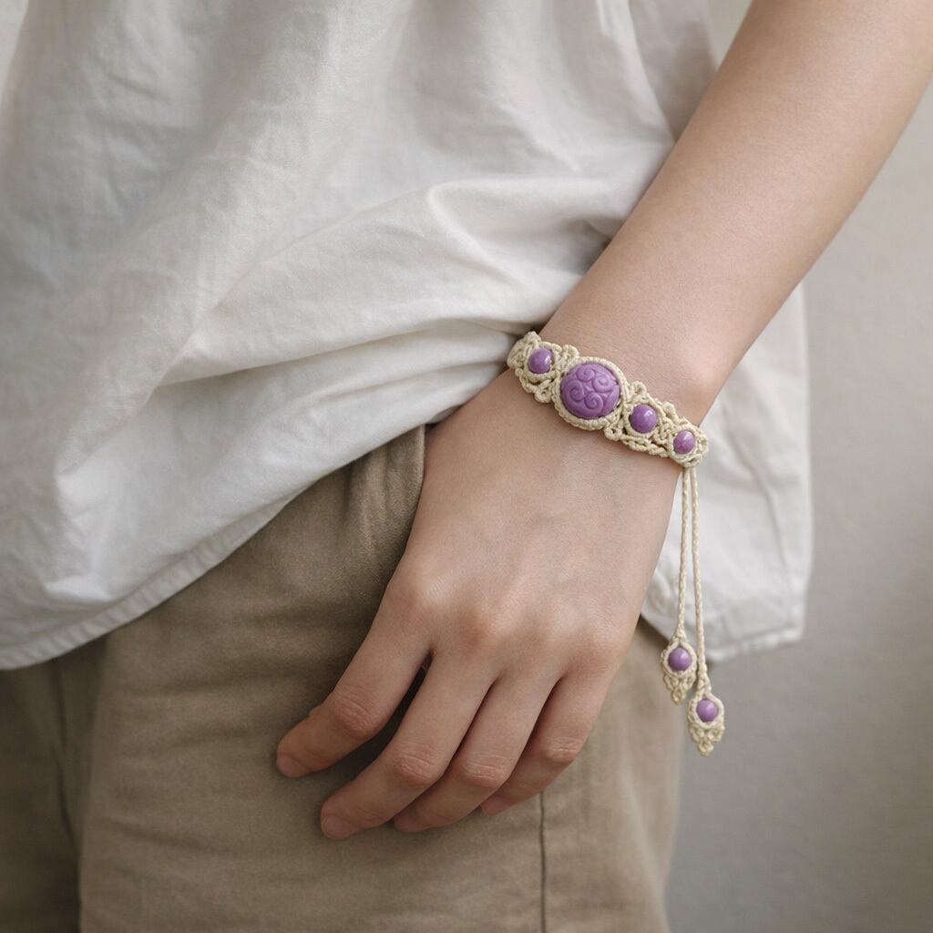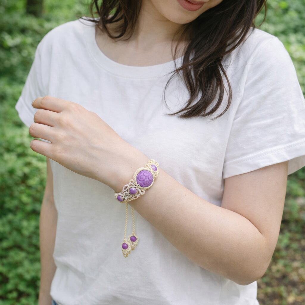 『フォスフォシデライト』心を癒す紫魔石マニ車彫マクラメブレスレット