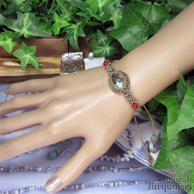 邪を退ける魔石『ターコイズ・トルコ』本珊瑚マクラメ編ハンドメイドブレスレット