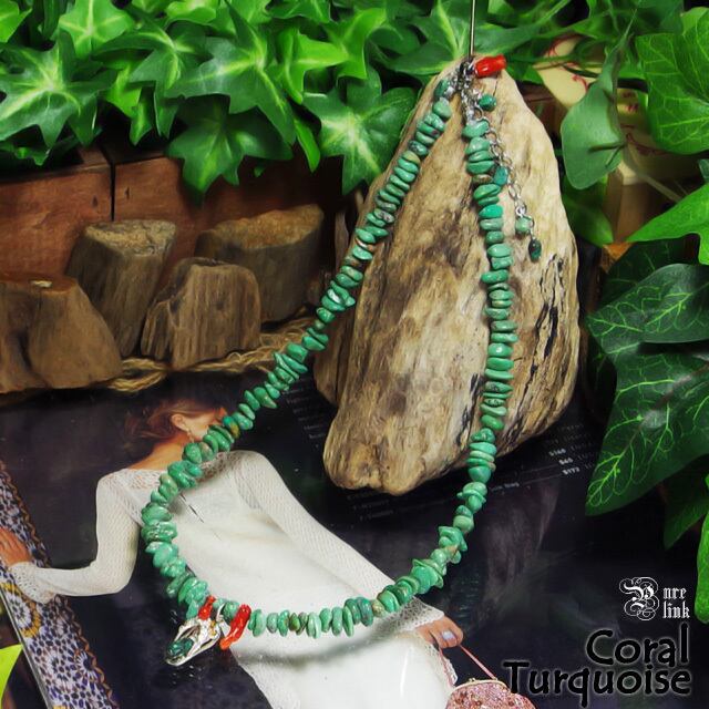 味わい深いグリーン系の天然ターコイズと、希少な天然・無染色の本赤珊瑚。
