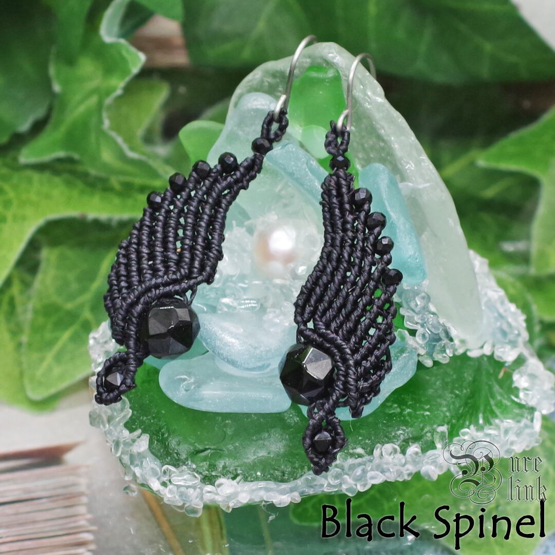 ブラックスピネル 天然石ピアス《マクラメ編み》天使の翼デザイン