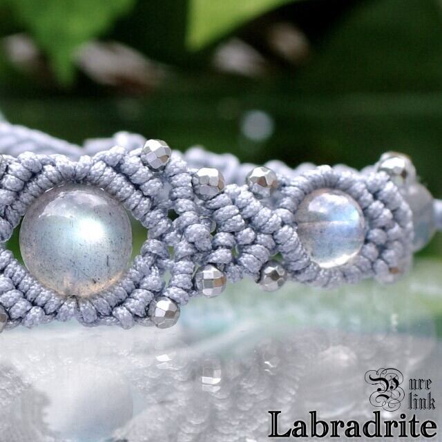 糸にはアジアンコード(ライトグレー)を使用しており、ラブラドライトの青い光を邪魔せず、静かな透明感を引き立てる色合いです。