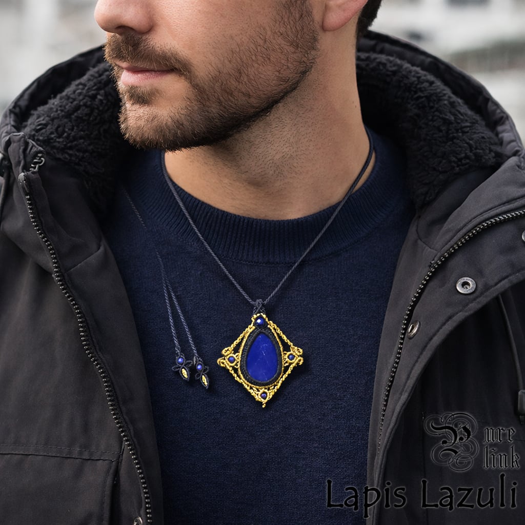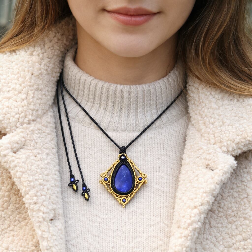 中央には存在感のあるラピスラズリを配し、その周囲をマクラメ編みで丁寧に囲んだトップネックレスです。