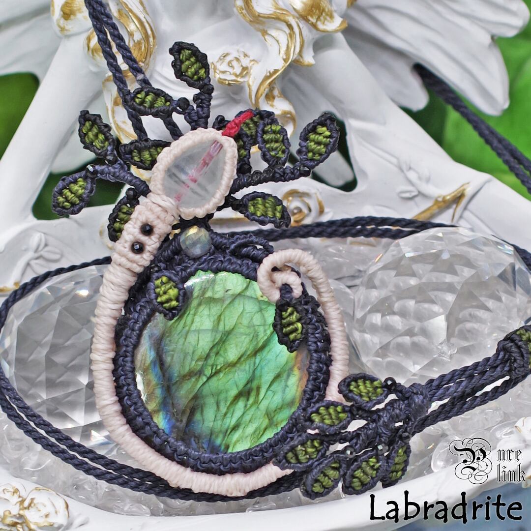そんな、幻想的な輝きを放つ『ラブラドライト』を使用し、『Tree of Life/生命の樹』と神の使いと言われ、干支でもある蛇のモチーフをまとわせ、より石達の力が発揮できるように願いを込め丁寧に編んで作成した、当ショップオリジナルのハンドメイドマクラメ編ネックレスです。
