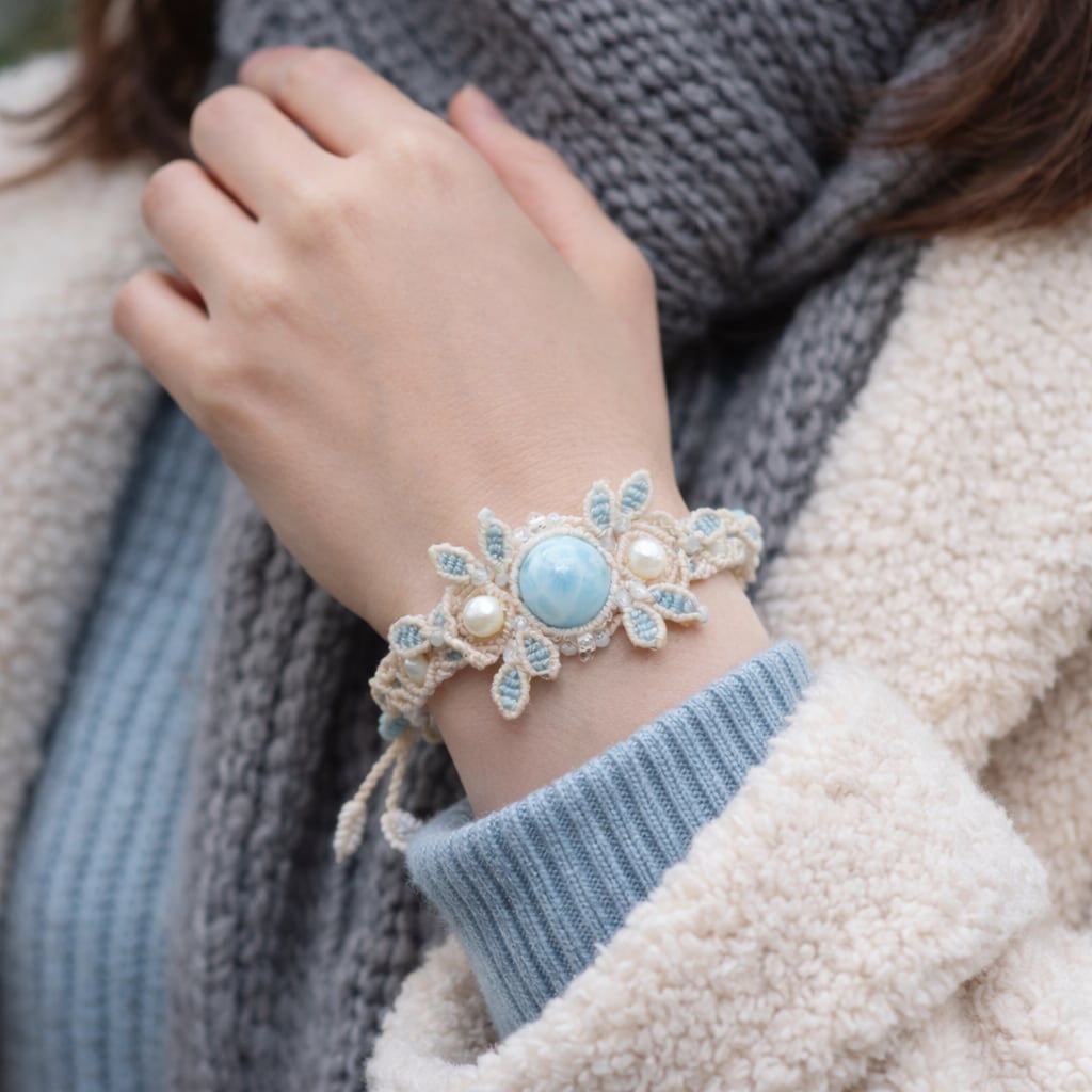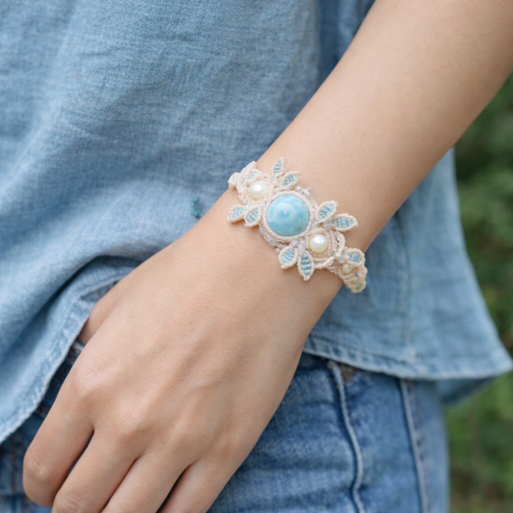 身に着ける方の時間に、そっと寄り添う存在になるよう願いを込めて仕立てたマクラメ作品です。