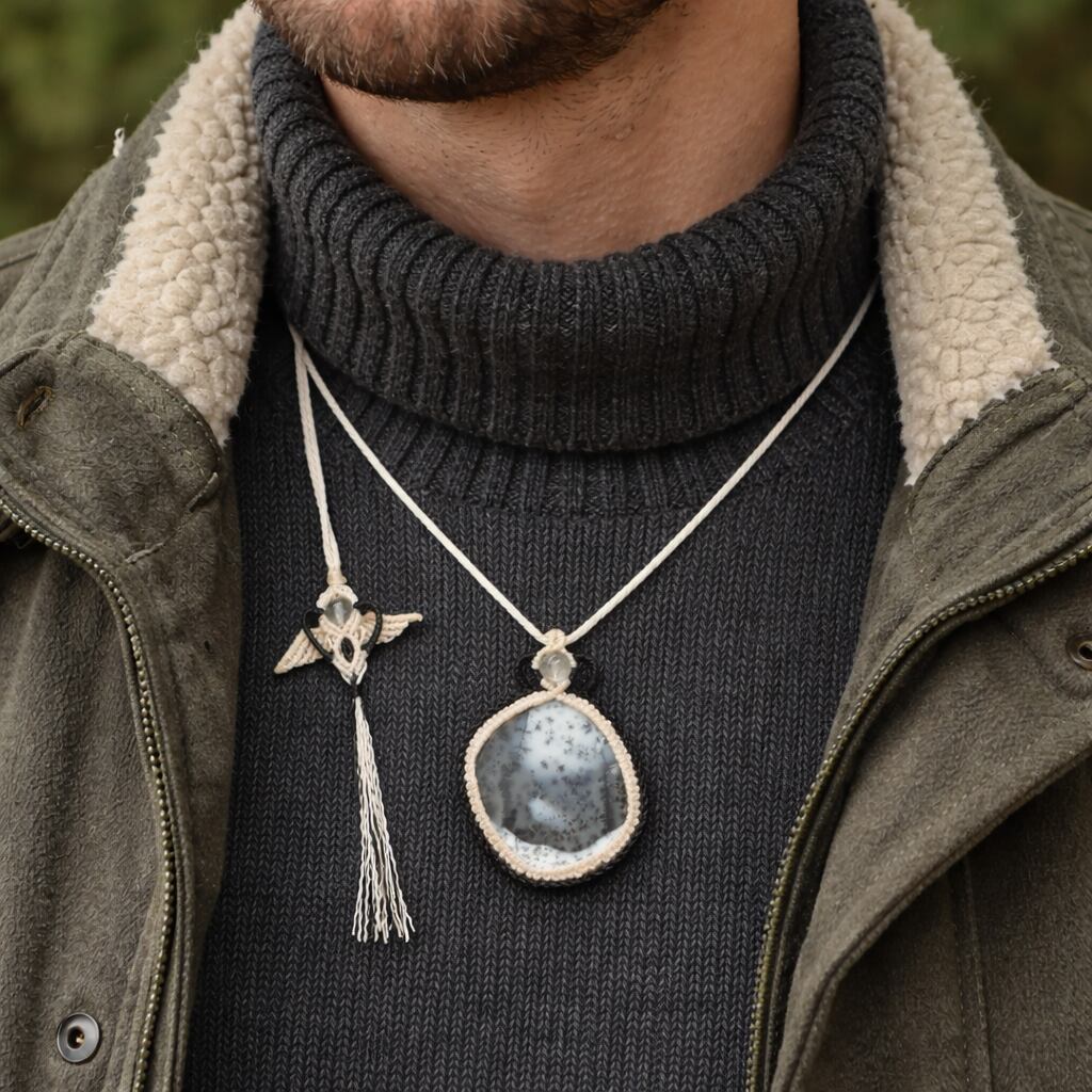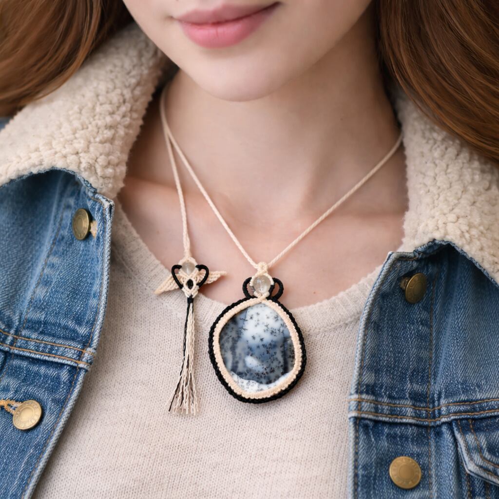 そんな、『デンドライトオパール』と同じく希少な『デンドライトクォーツ』を使用して、見た目だけでなく、頼もしいお守りとしてもご利用いただけるよう、願いを込めて丁寧に編み込まれた当ショップオリジナルのマクラメ編ネックレスです。サイズ調整も可能なので、様々な方にお楽しみいただけます。