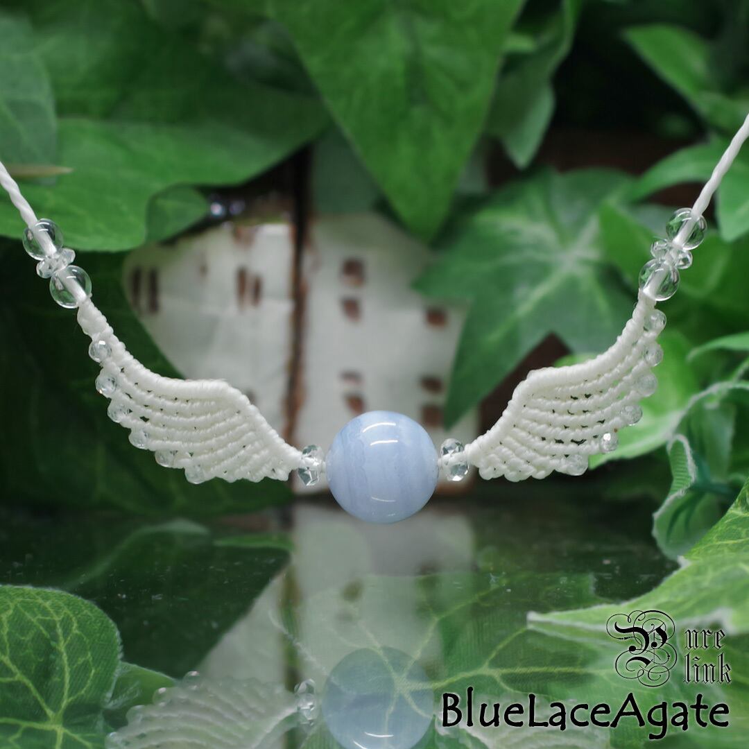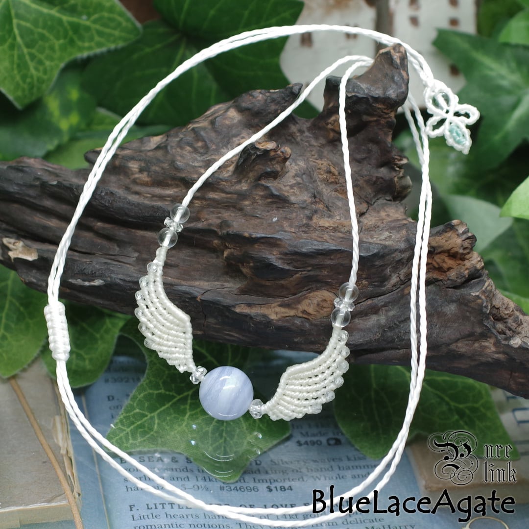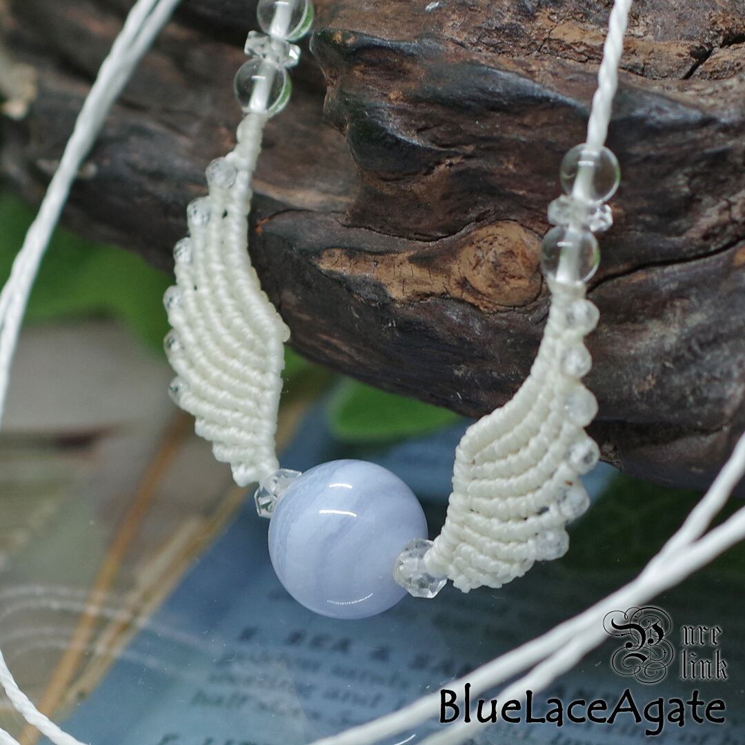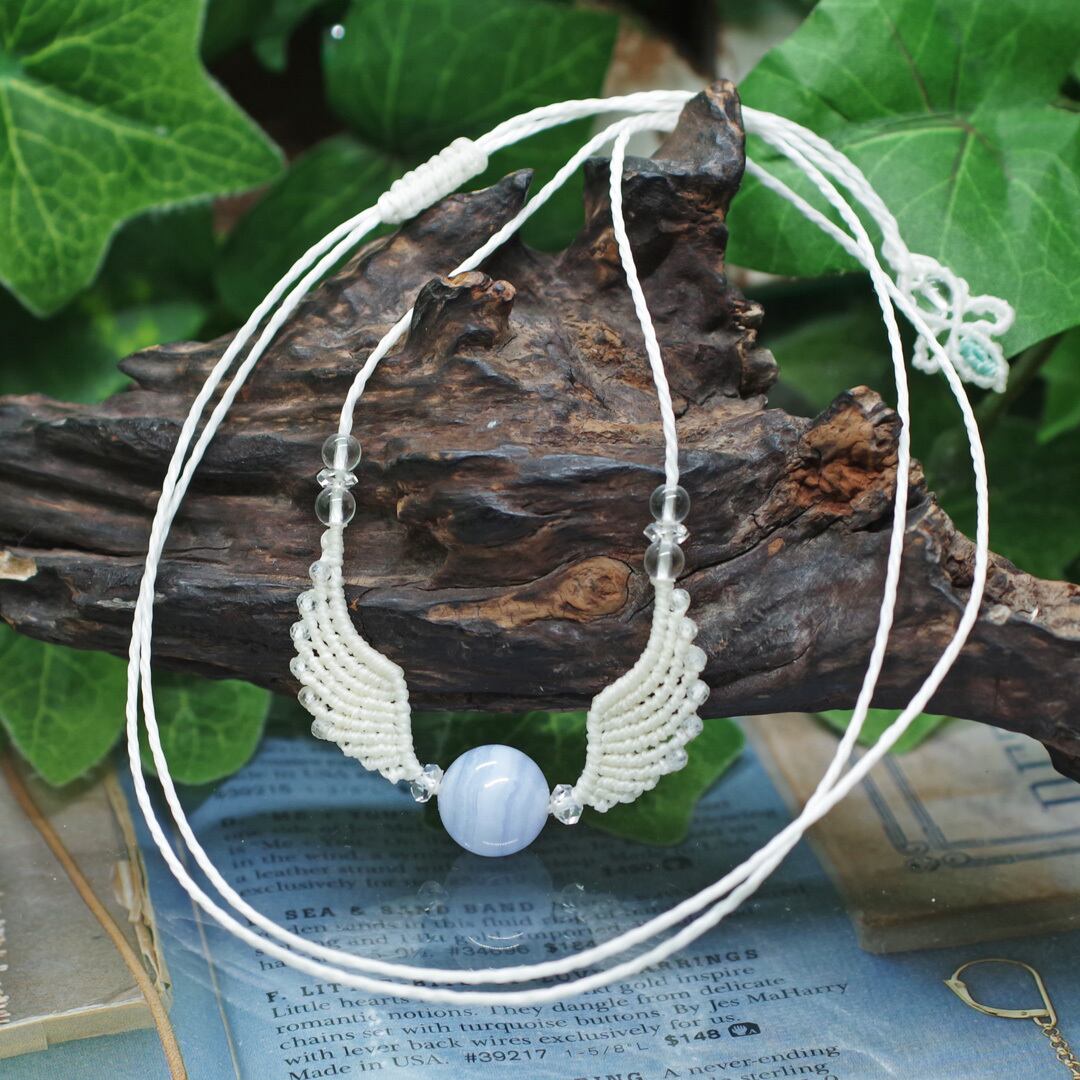 そんな、『ブルーレースアゲート』や『水晶』を使用して、丁寧に羽・翼をモチーフに編み込み、ただのアクセサリーではなく頼もしいお守りにもなるように、願いを込めて作成した、マクラメ編みトップネックレスです。(*´▽`*)