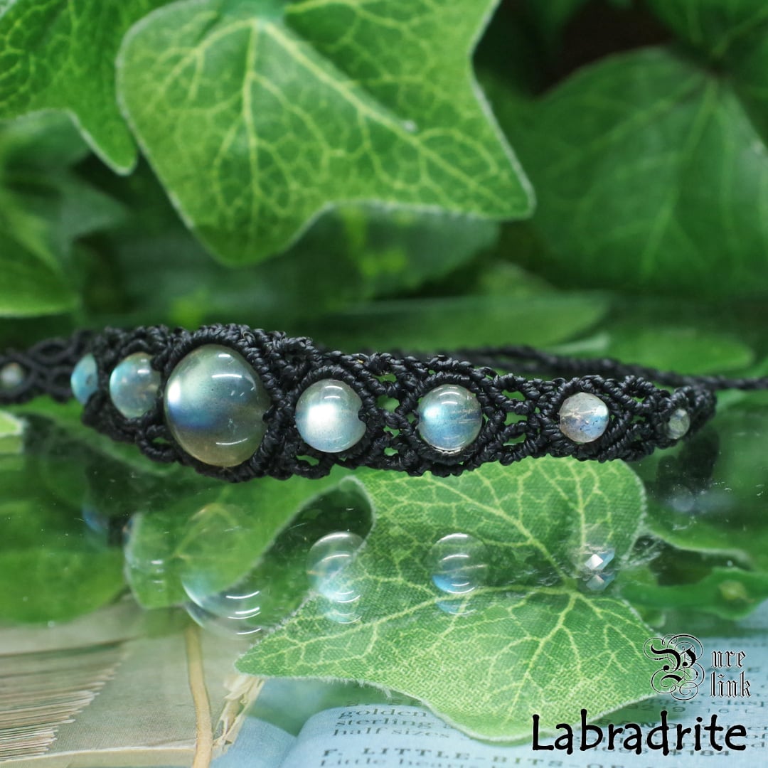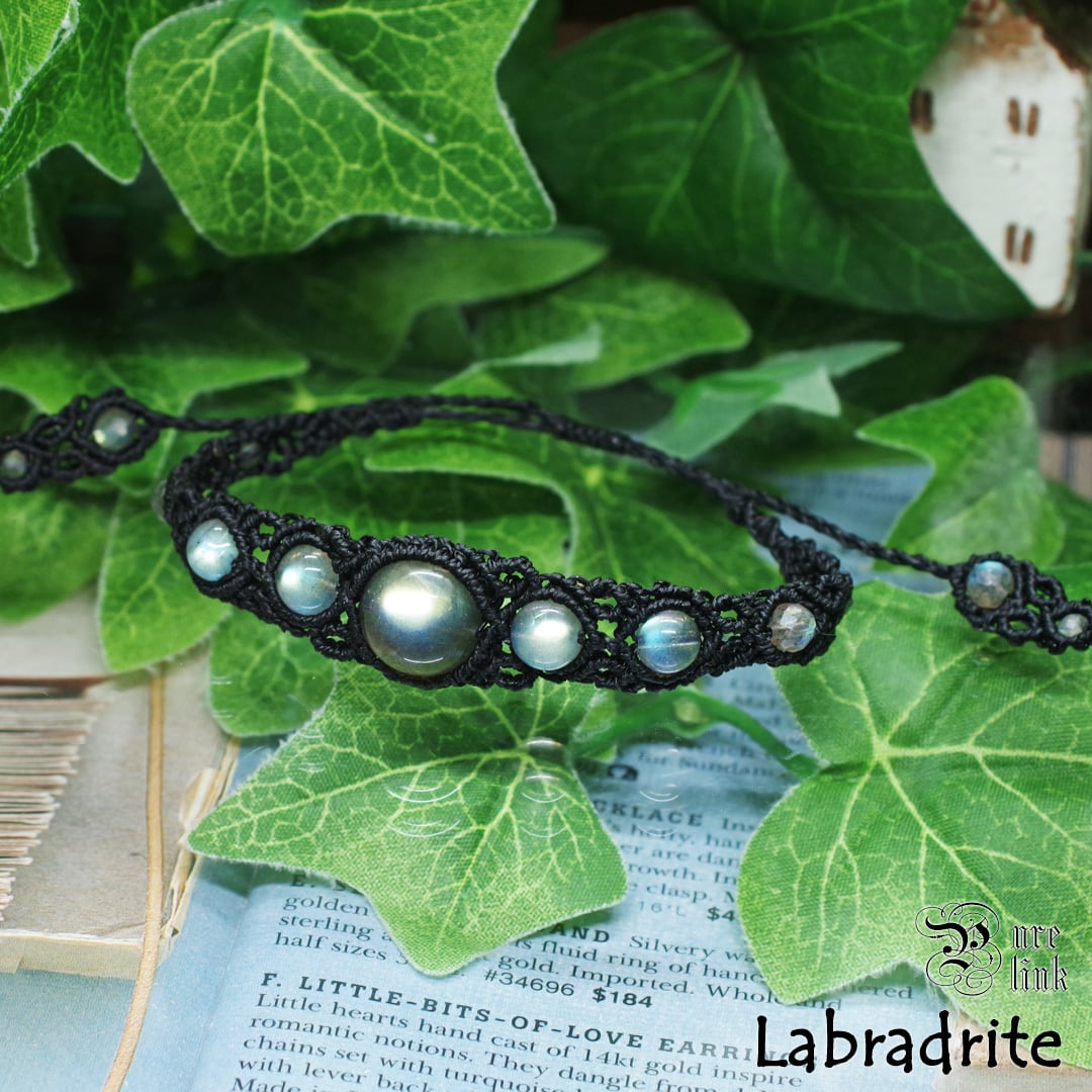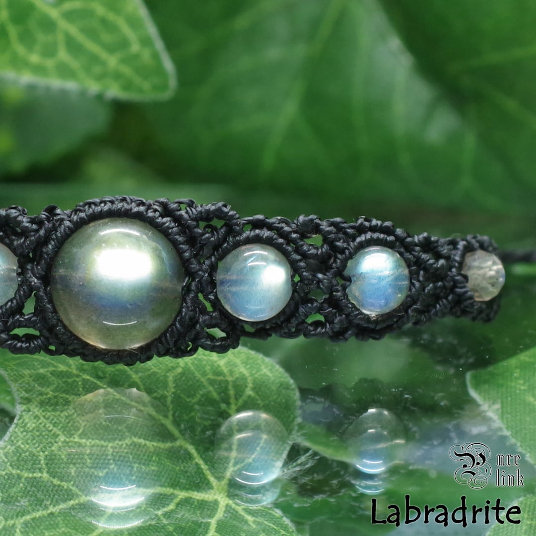そんな美しい選別した高品質の『ラブラドライト』を使用して、見た目だけでなく頼もしいお守りにもなるように丁寧に編んで作成したサイズ調整も可能なマクラメ編ブレスレットです。