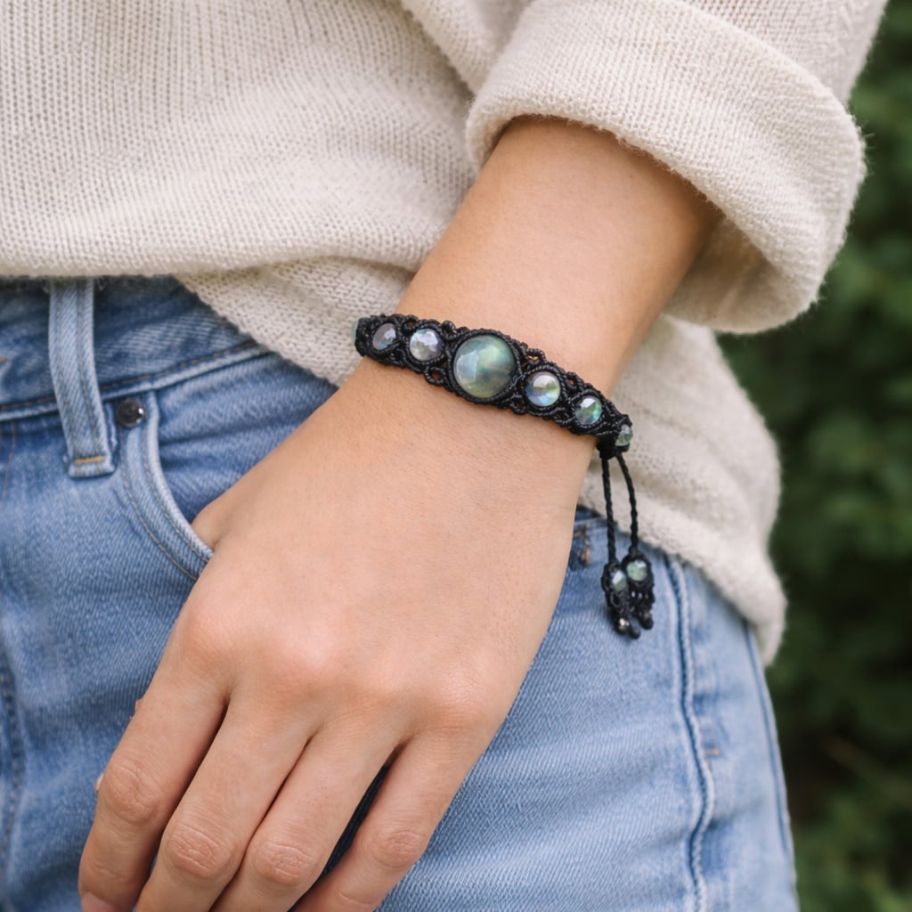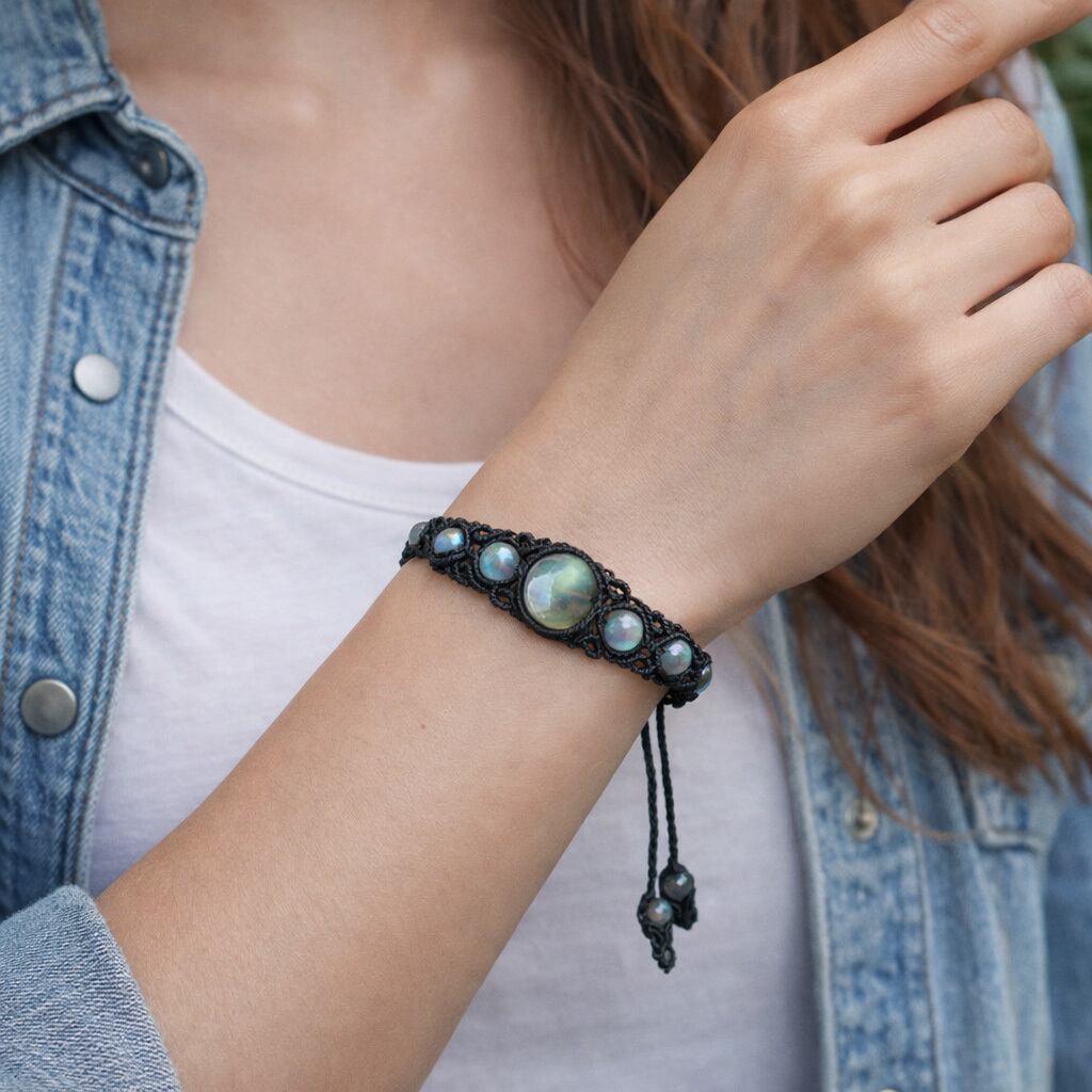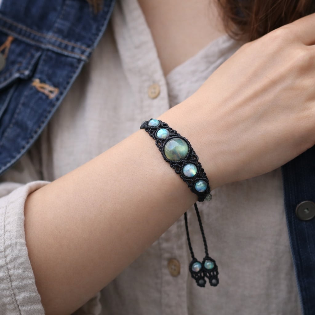 そんな美しい選別した高品質の『ラブラドライト』を使用して、見た目だけでなく頼もしいお守りにもなるように丁寧に編んで作成したサイズ調整も可能なマクラメ編ブレスレットです。