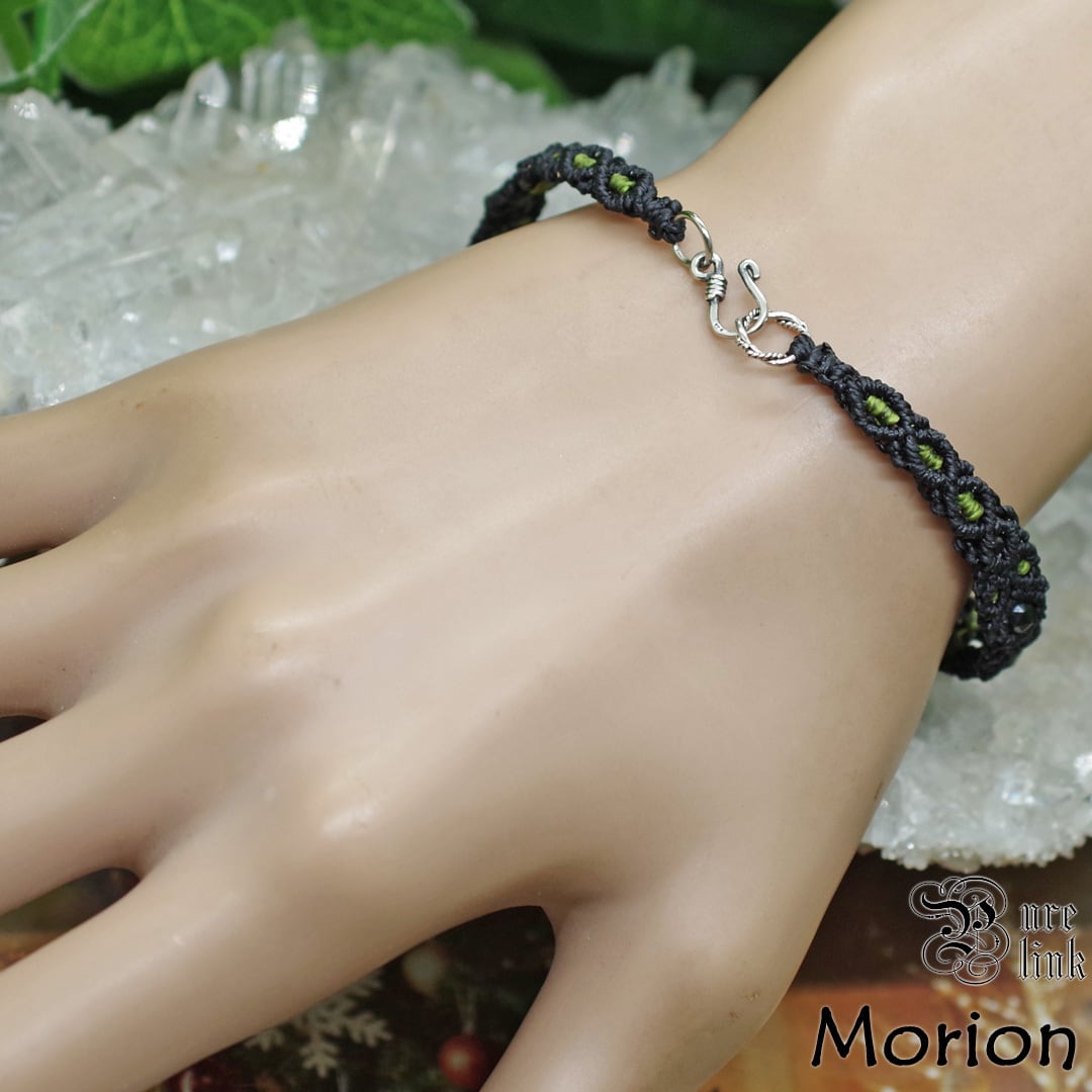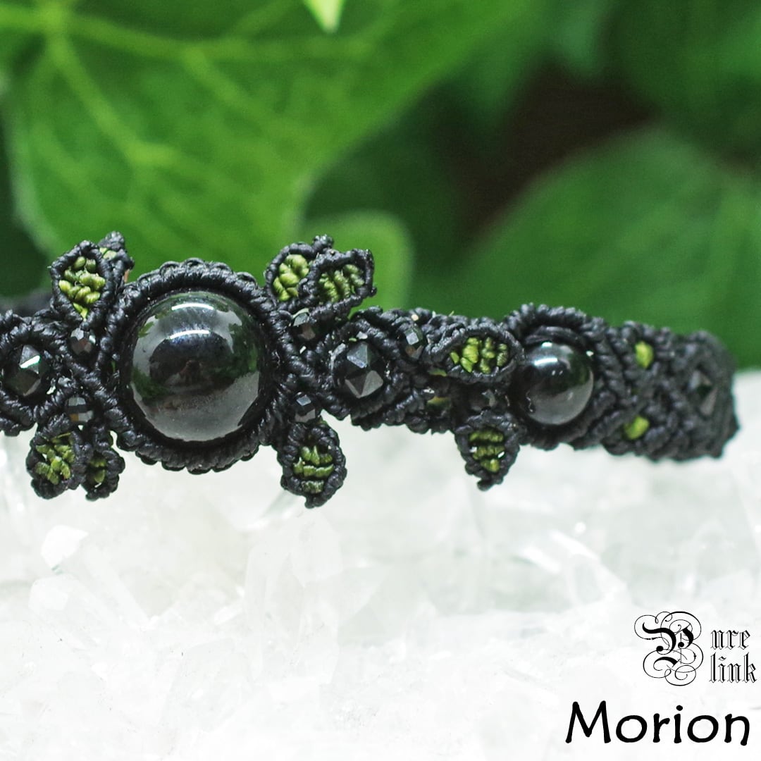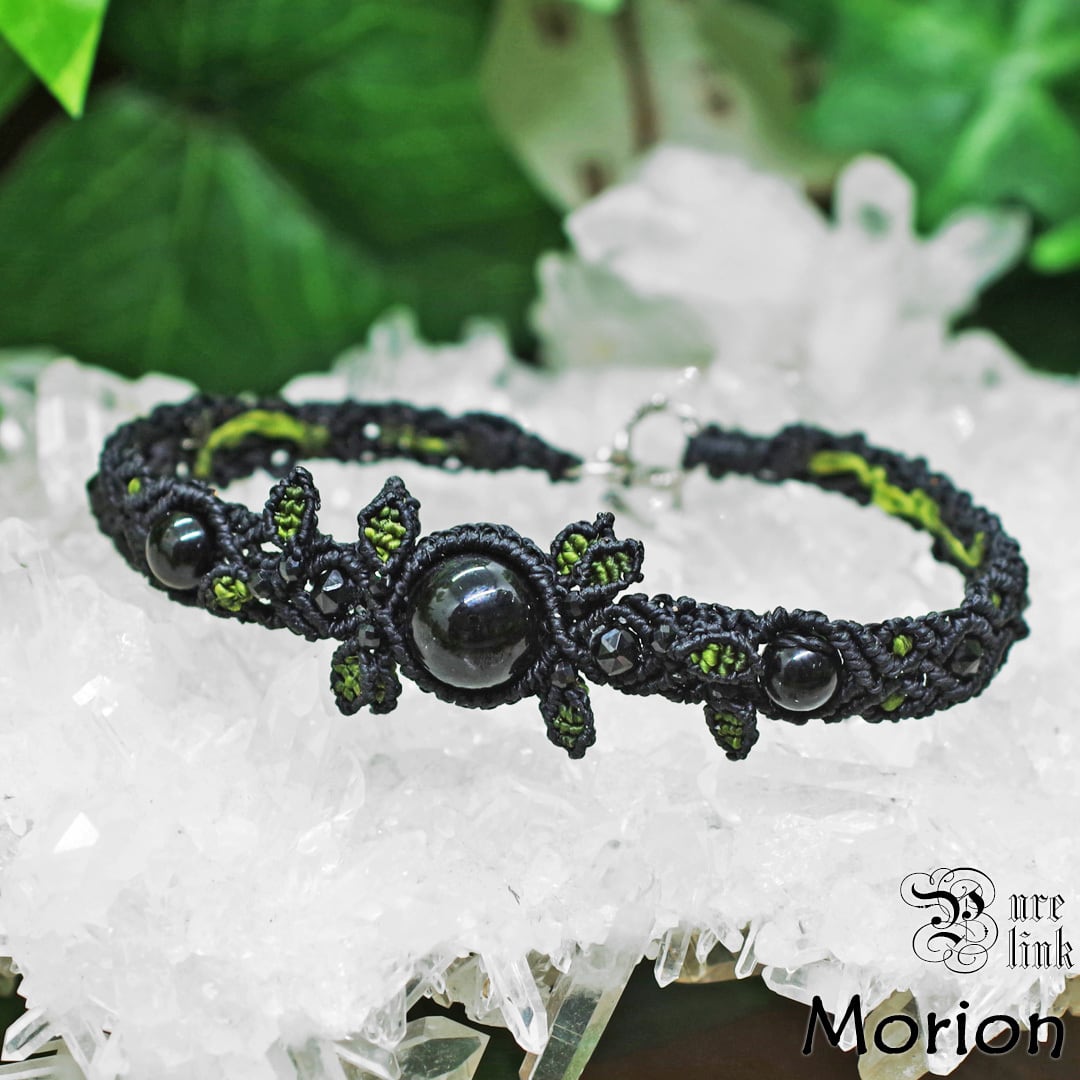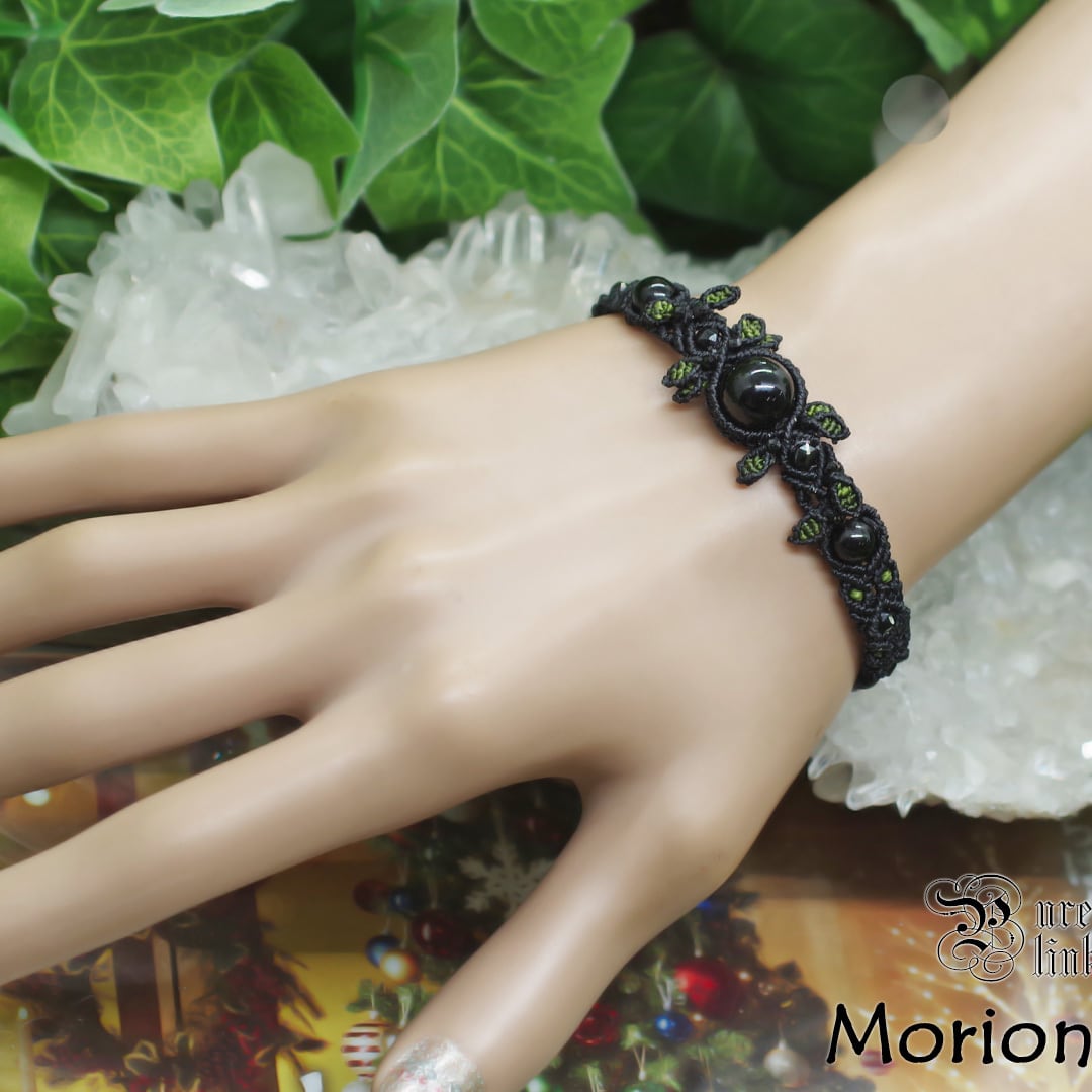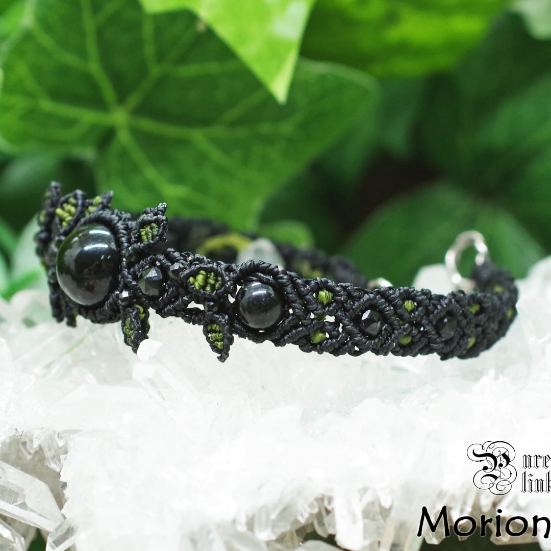 と、そんな黒く美しい『黒水晶・モリオン』美しい黒石でキラキラと輝く『ブラックスピネル』を使用しリーフモチーフなど、丁寧にマクラメ編みで作成し、手間暇心を込めて作成した、安価な輸入品・大量生産品には負けない当ショップオススメのオリジナルのハンドメイドブレスレットです。