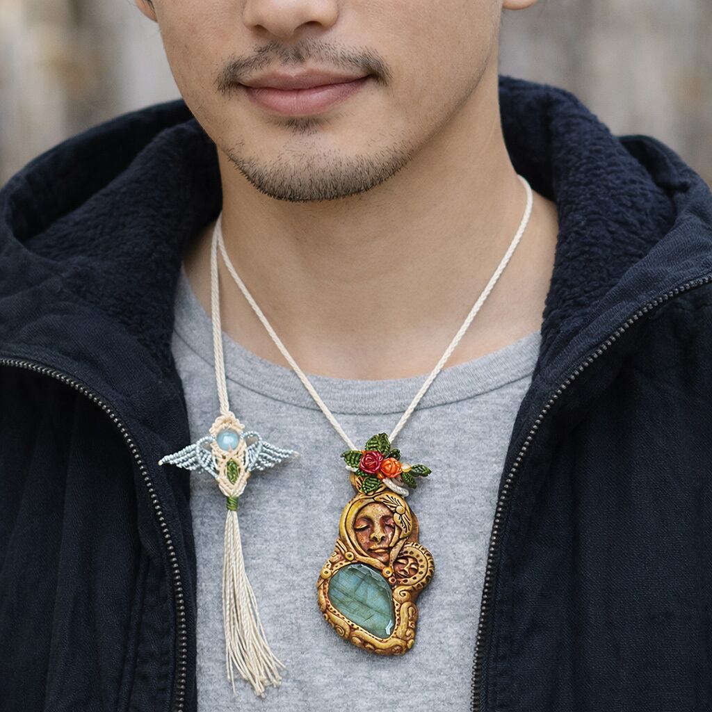 マクラメ編みとクレイアートのコラボネックレスは他ではあまりまだ見られないと思います。なお、こちらも、スライドすることによりサイズ調整も可能な男女共におススメの1点もののハンドメイドマクラメ編みネックレスです。自分の魅力を引き出し、勇気や精神力を高めるパワーストーンの力を、身につけてみませんか?