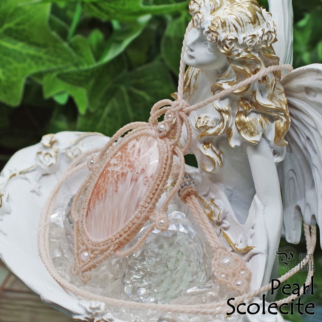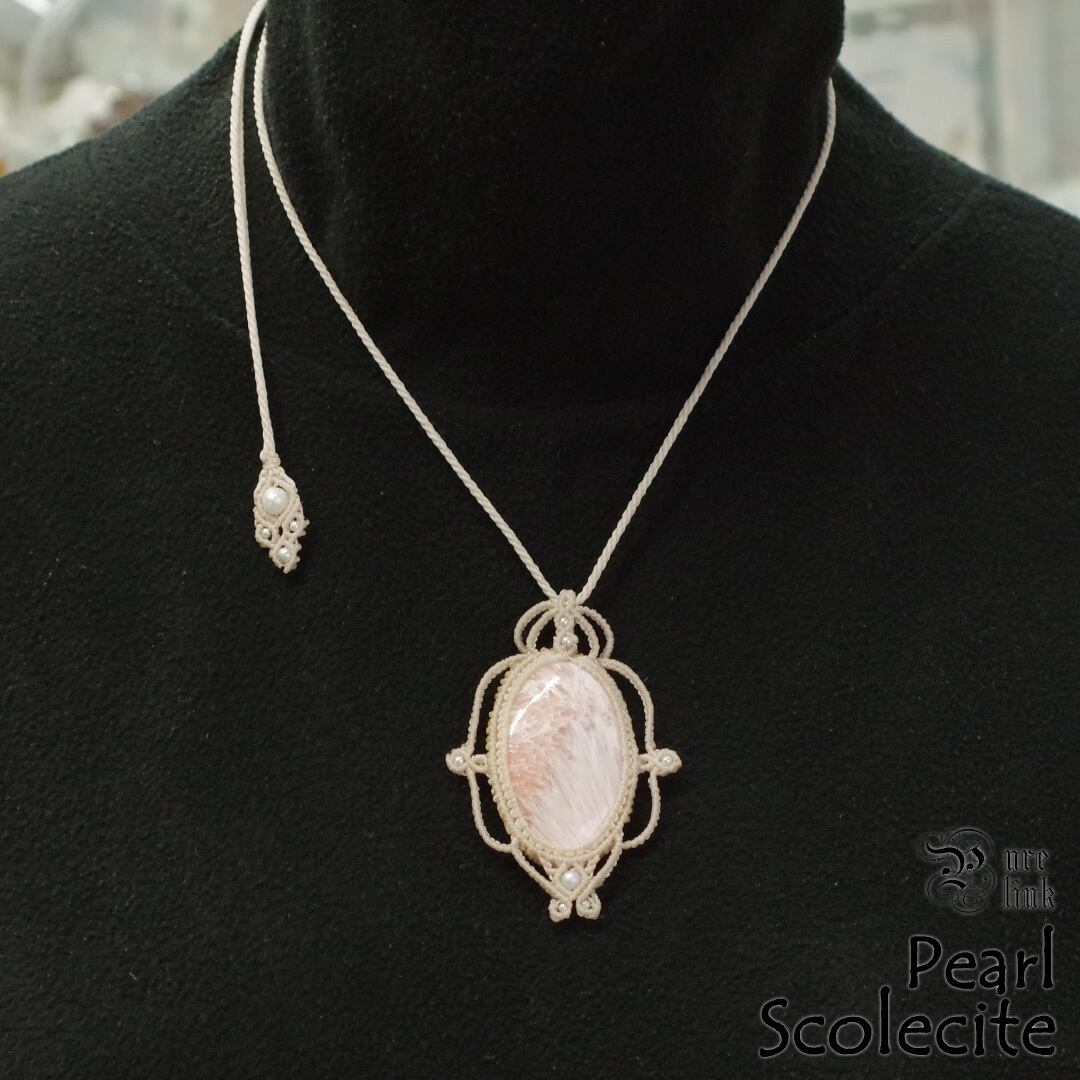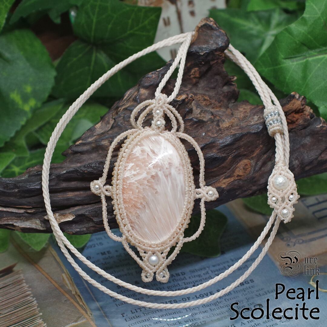 そして、使用しているのは、ホワイトと放射線状に広がるサーモンピンクが美しい『ピンクスコレサイト』や『パール』を使用し、ただのアクセサリーではなく、頼もしいお守りにもなるように、願いを込め丁寧に編んで作成した、スライドすることによりサイズ調整も可能な男女共におススメの1点ものの、当ショップオリジナルのハンドメイドマクラメ編ネックレスです。