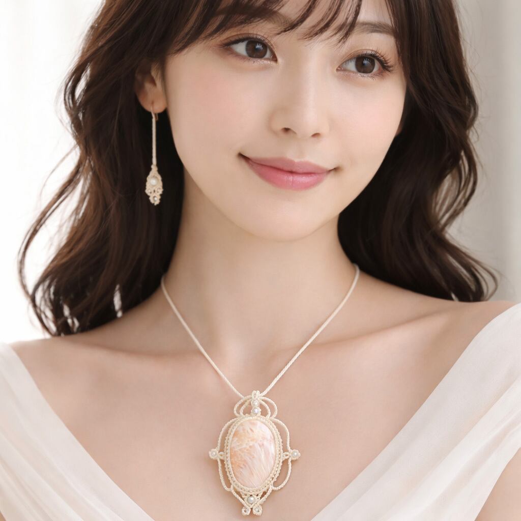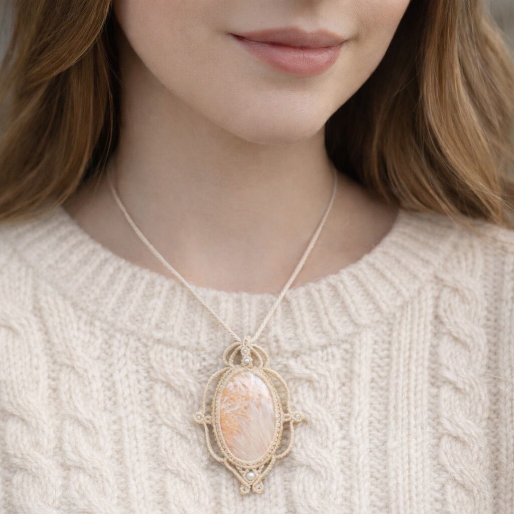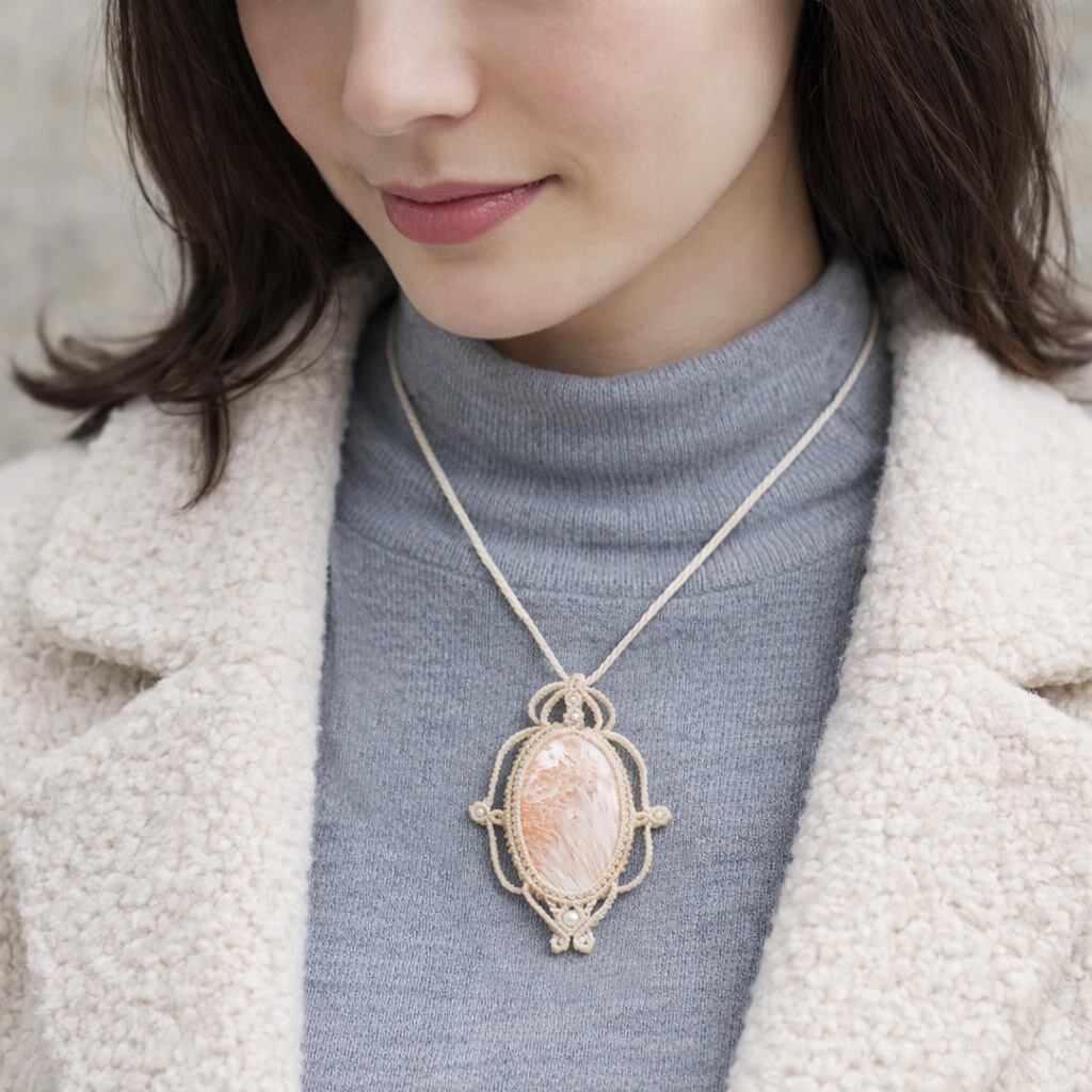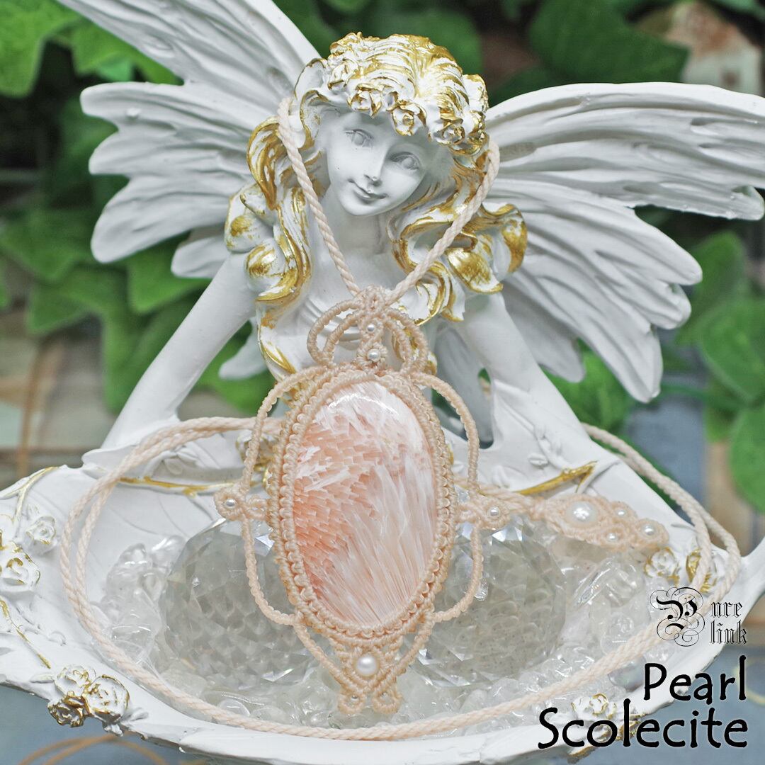 そして、使用しているのは、ホワイトと放射線状に広がるサーモンピンクが美しい『ピンクスコレサイト』や『パール』を使用し、ただのアクセサリーではなく、頼もしいお守りにもなるように、願いを込め丁寧に編んで作成した、スライドすることによりサイズ調整も可能な男女共におススメの1点ものの、当ショップオリジナルのハンドメイドマクラメ編ネックレスです。
