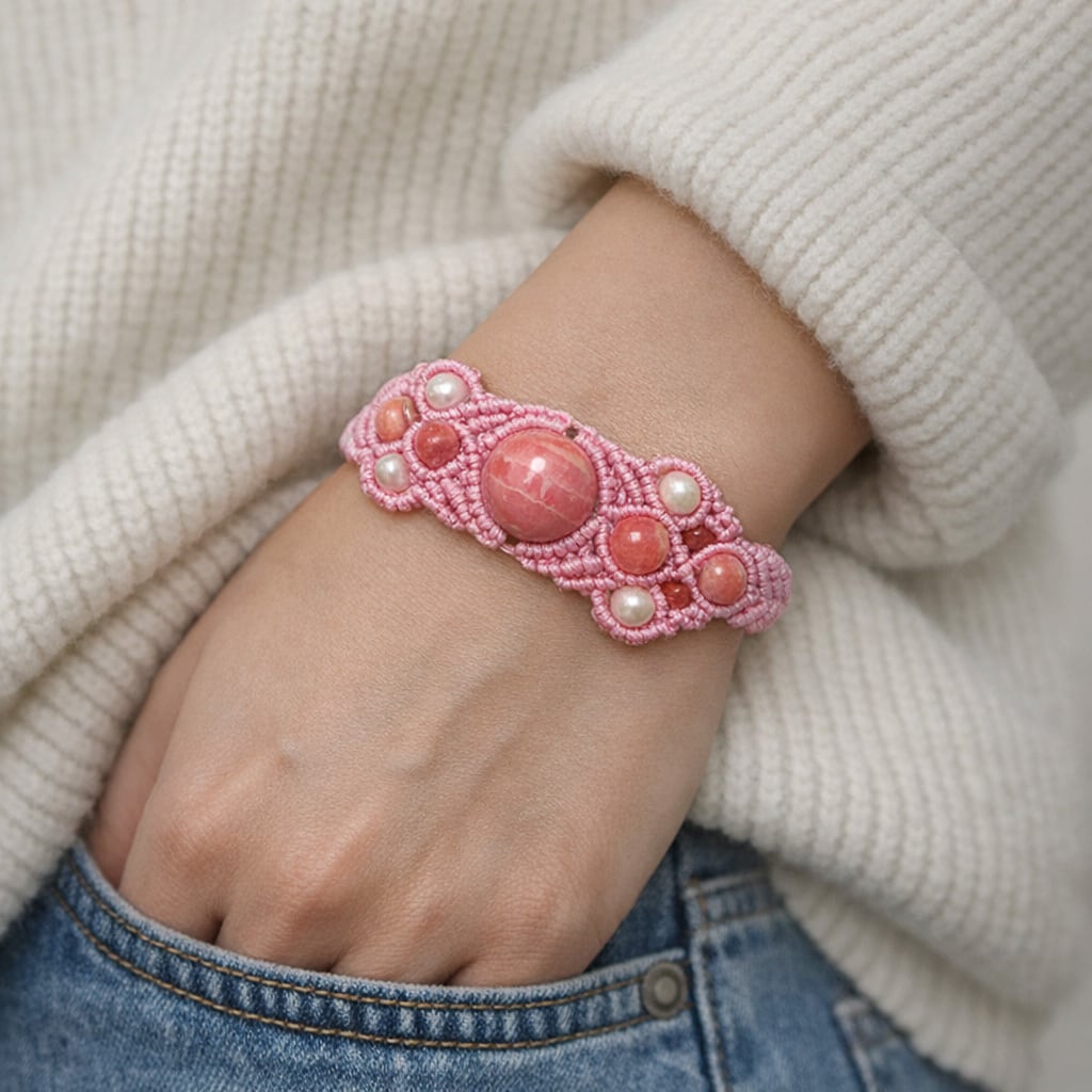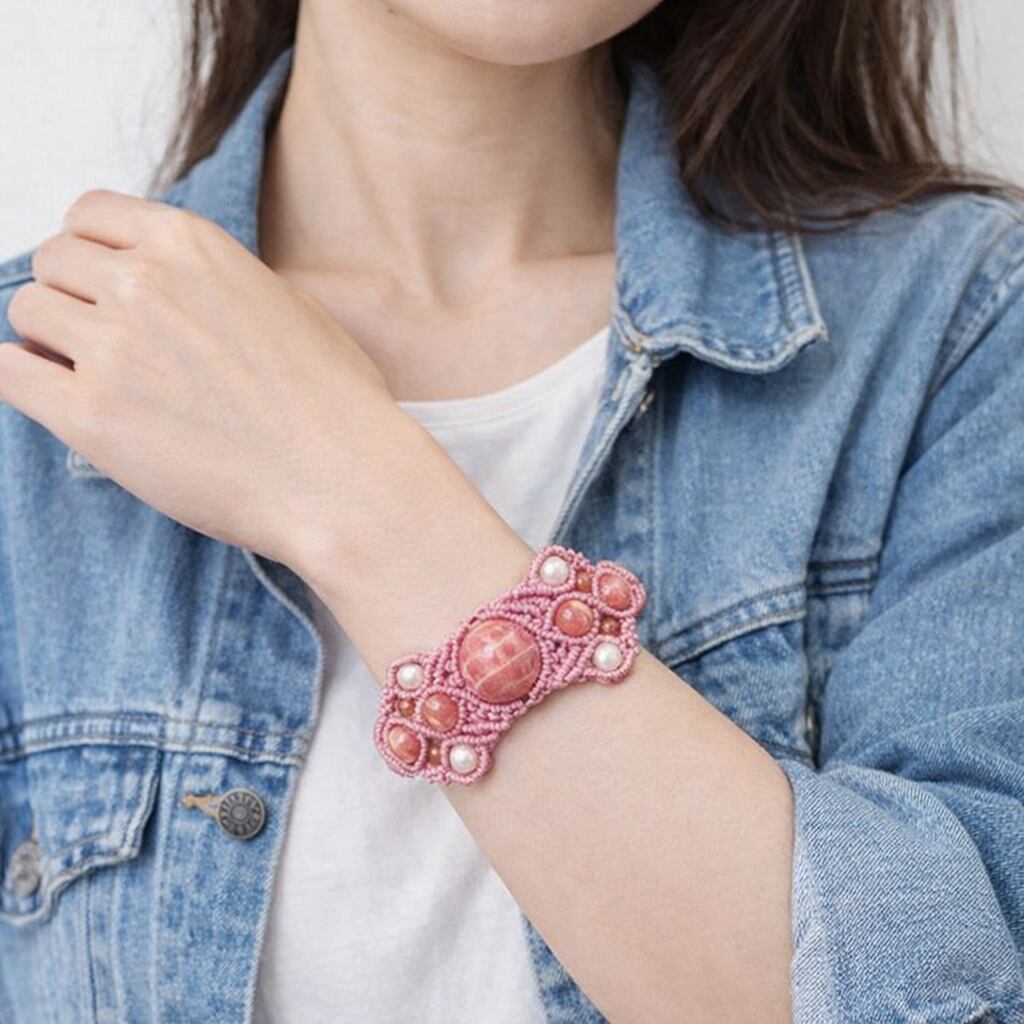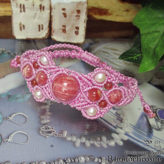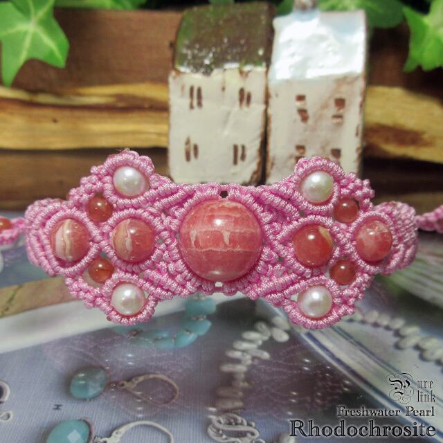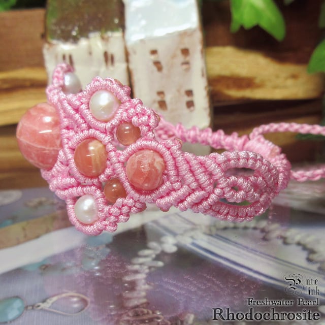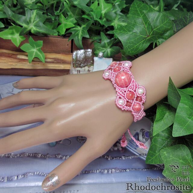 『ロードクロサイト』と『パール』マクラメ編ブレスレット