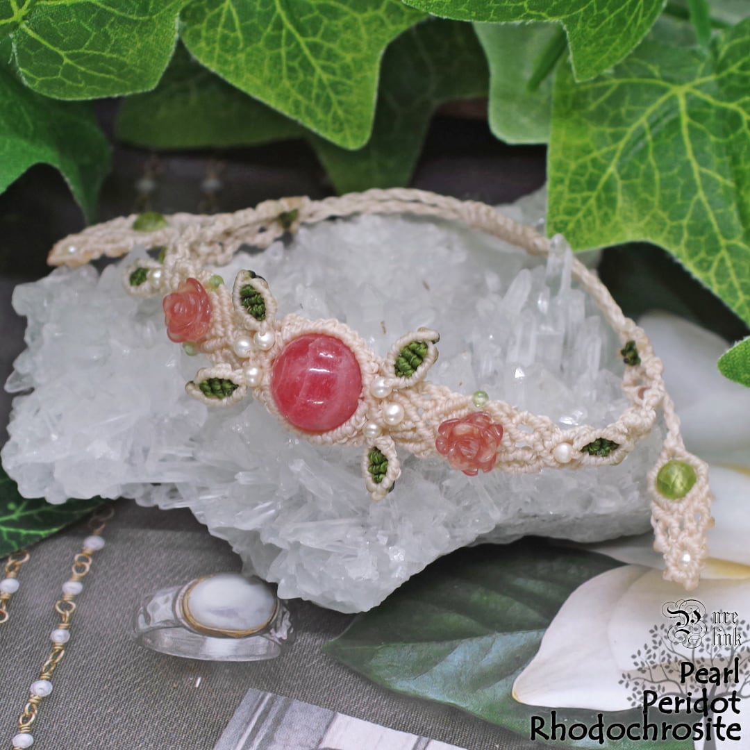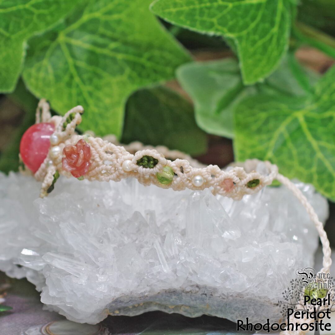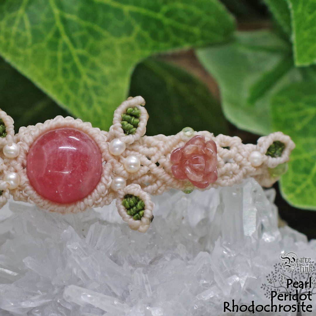 そして、『ロードクロサイト』は中央の丸玉だけでなく、愛を象徴する花『薔薇』の形に彫刻された『ロードクロサイト』と恋の宝石『パール』萌ゆる新緑『ペリドット』も使用し、エデンの園の中央に植えられた木『Tree of Life/生命の樹』をイメージして、見た目だけでなく頼もしいお守りにもなるように、願いを込め丁寧に編んで作成した、サイズ調整も可能な当ショップオリジナルのハンドメイドマクラメ編ブレスレットです。