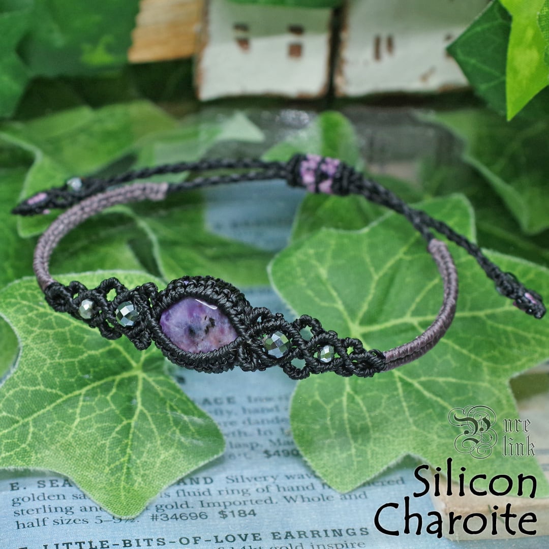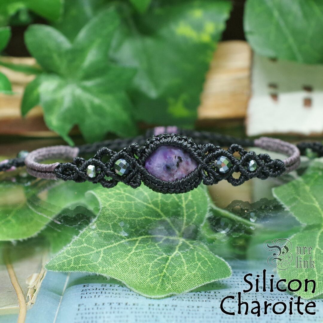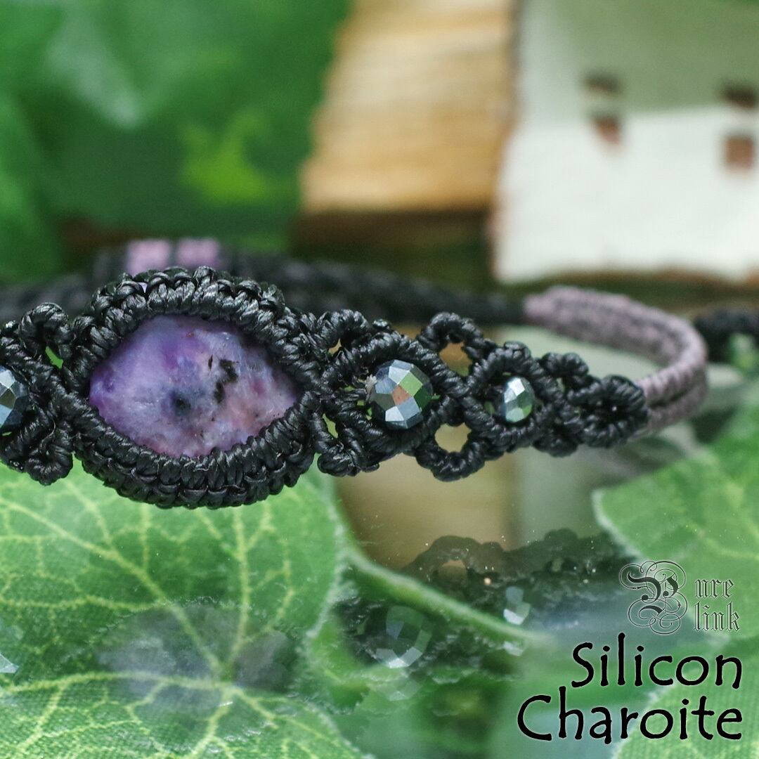 と…そんな魅惑する宝石『チャロアイト』と『シリコン/テラヘルツ』を使用し、見た目だけでなく、頼もしいお守りにもなるように、願いを込め丁寧に編んで作成した、サイズ調整も可能な当ショップオリジナルのハンドメイドマクラメ編ブレスレットです。