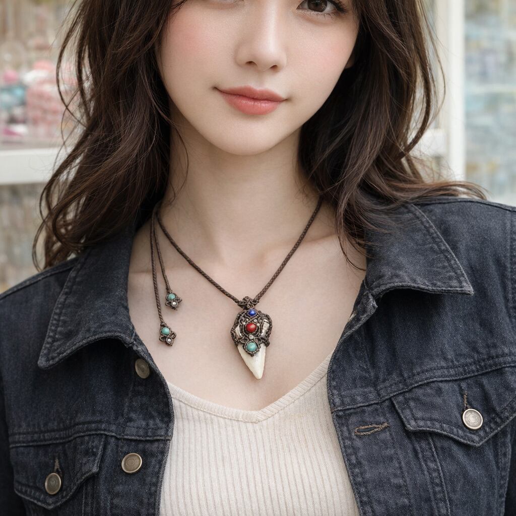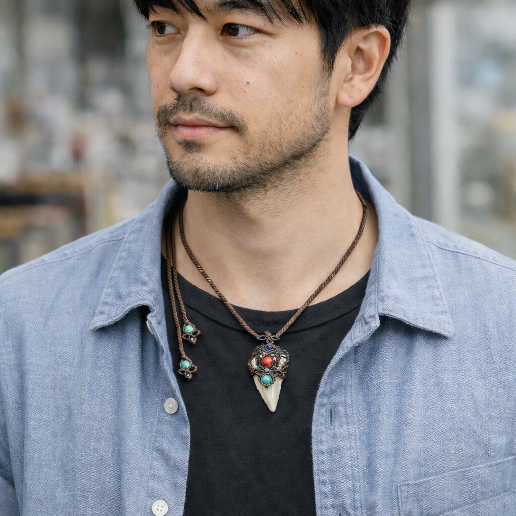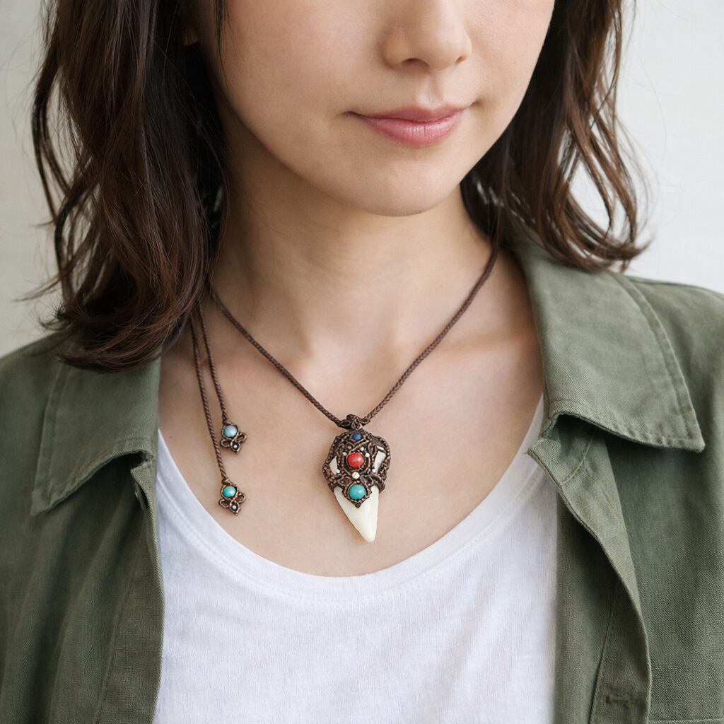 レア★古代鮫『サメの歯化石』魔石&カレンシルバーマクラメ編ネックレス