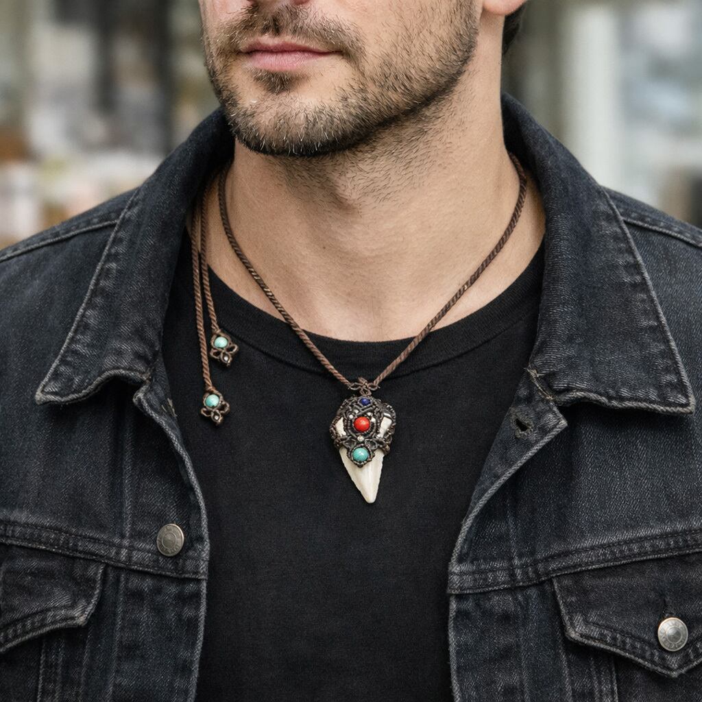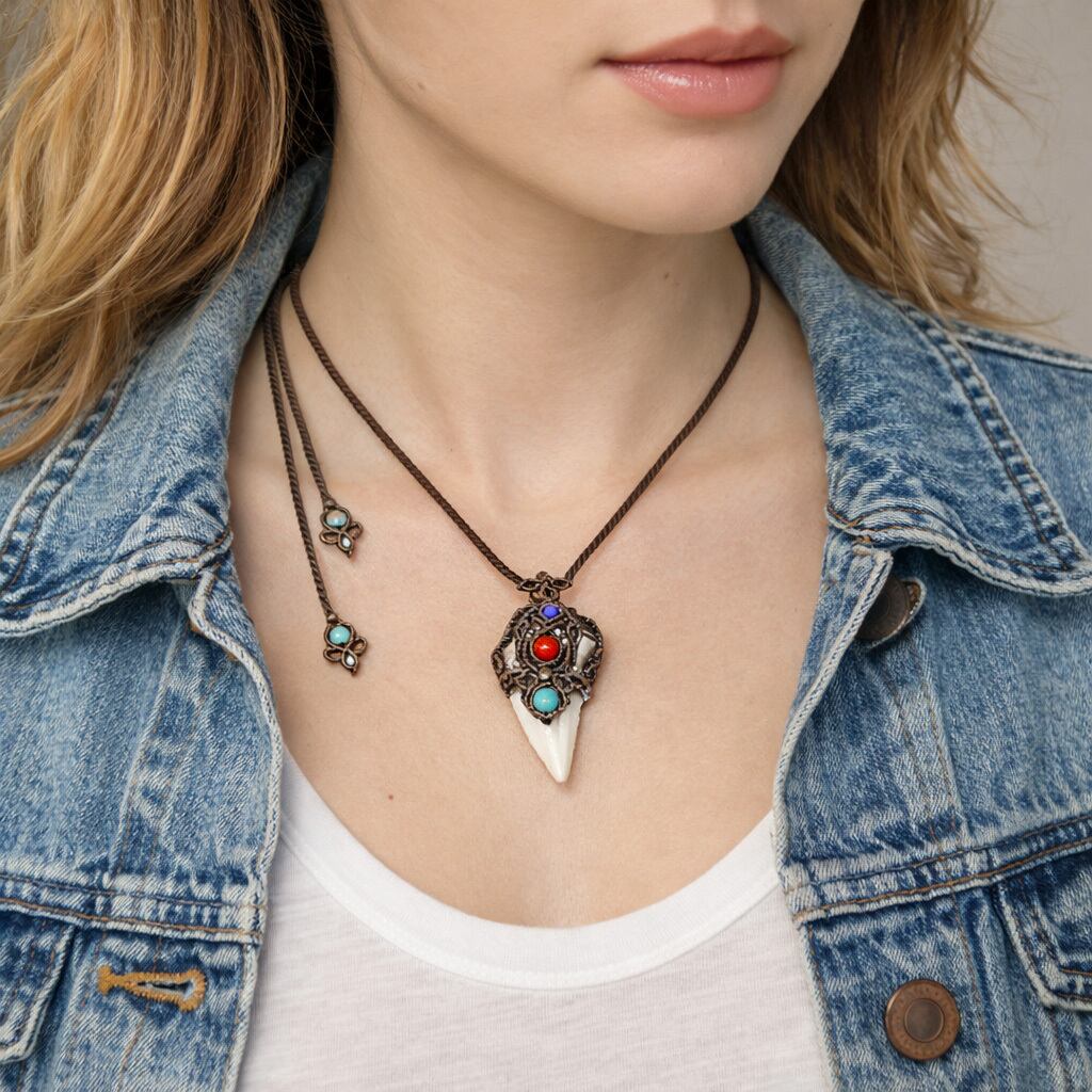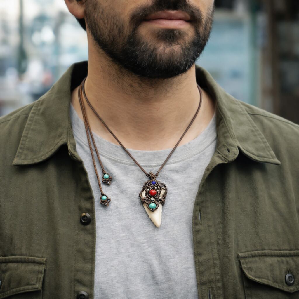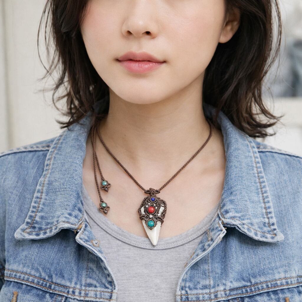 レア★古代鮫『サメの歯化石』魔石&カレンシルバーマクラメ編ネックレス