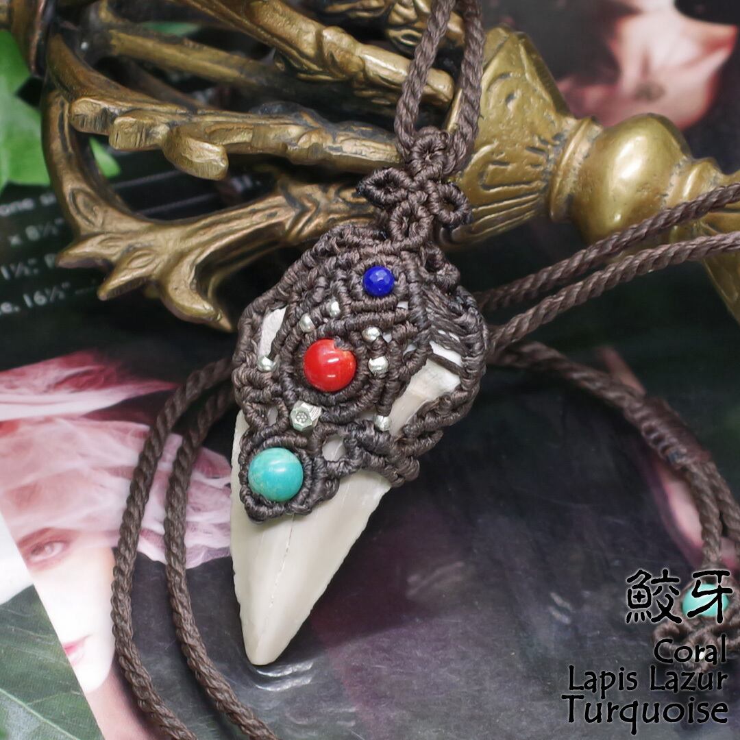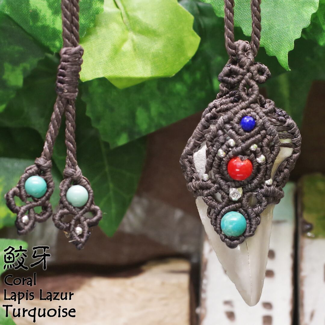 古代鮫の歯に、希少な天然の『本珊瑚/赤珊瑚』や『ターコイズ』『ラピスラズリ』にカレンシルバー等の純銀ビーズも使用した、他にはない、1点物の価値あるものだと思います。