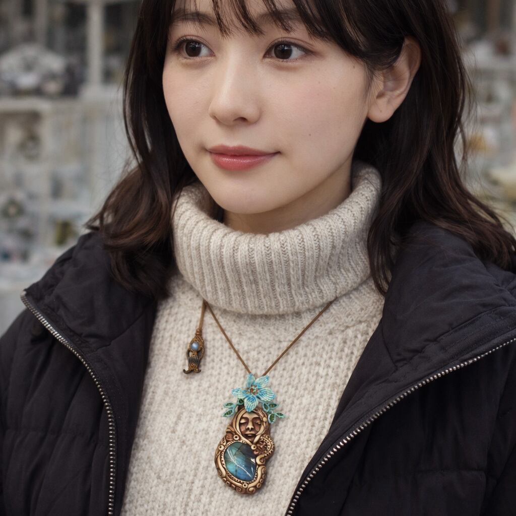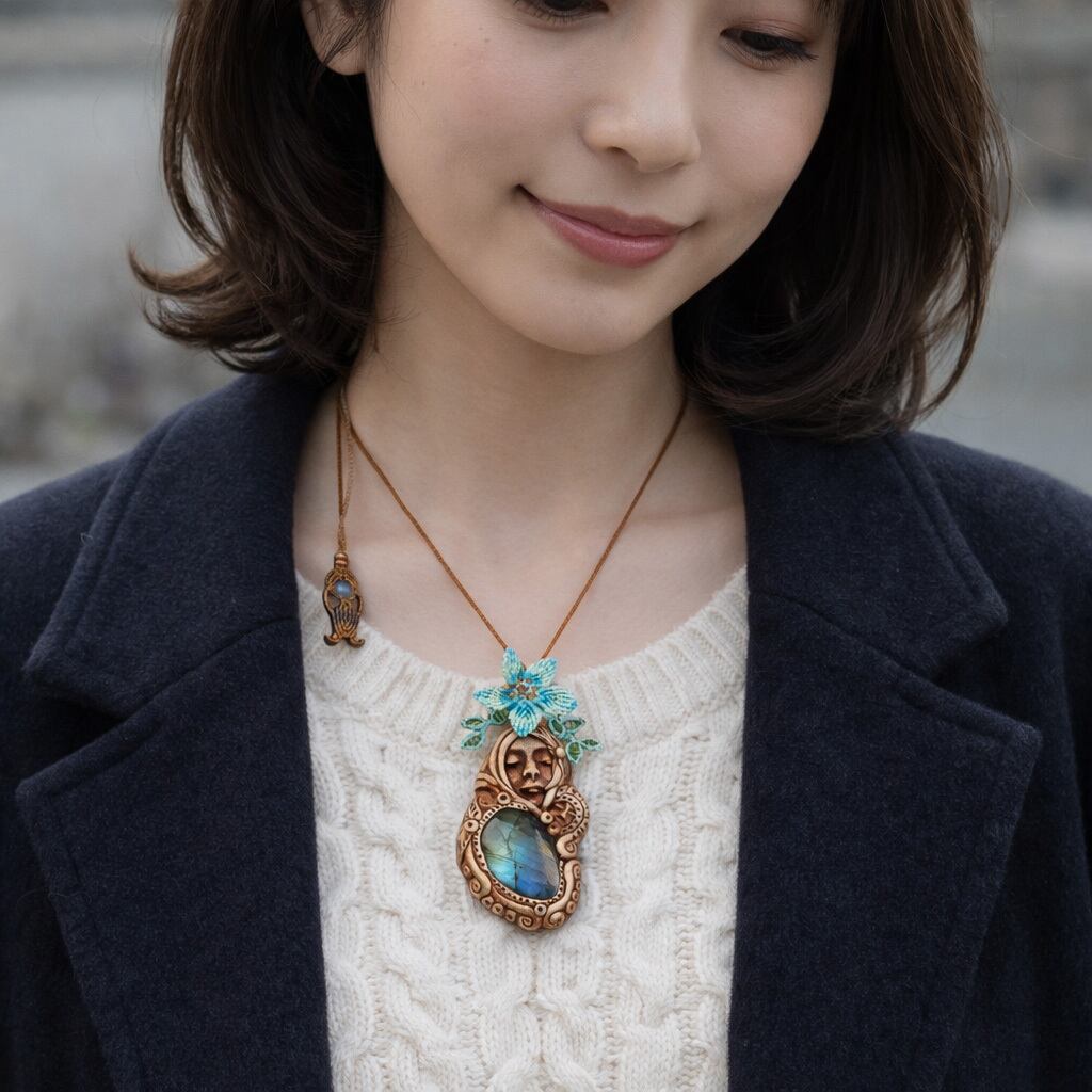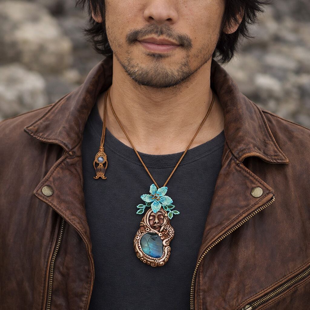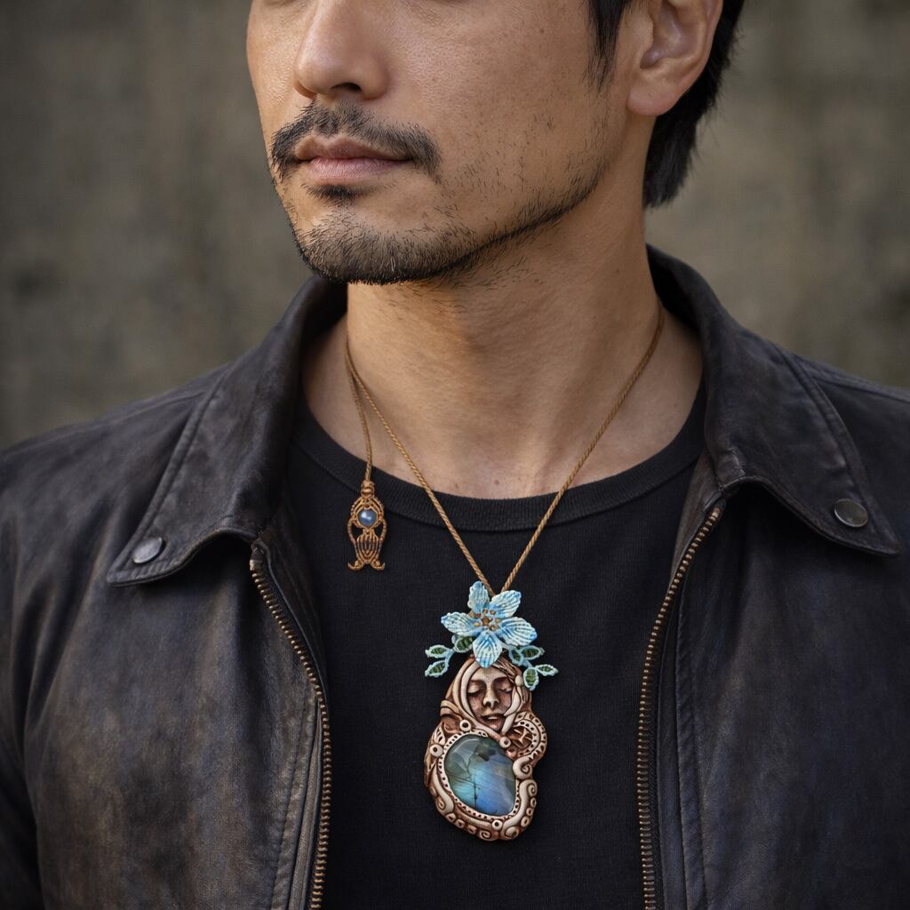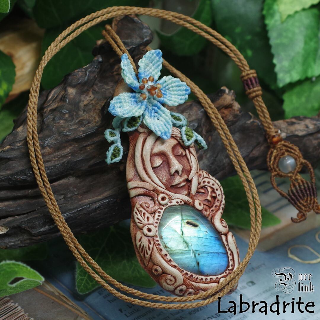 その神秘的な輝きを放つ『ラブラドライト』を使用した「聖母マリア」モチーフのクレイアートペンダントトップに、フラワーとリーフのモチーフをマクラメで編み込みました。さらに、オレンジガーネットとして知られる『ヘソナイト』を組み合わせ、見た目の美しさだけでなく、心強いお守りとして寄り添うよう丁寧に仕立てています。ラブラドライトの幻想的な光が、聖母マリアの神聖な印象をより引き立てています。