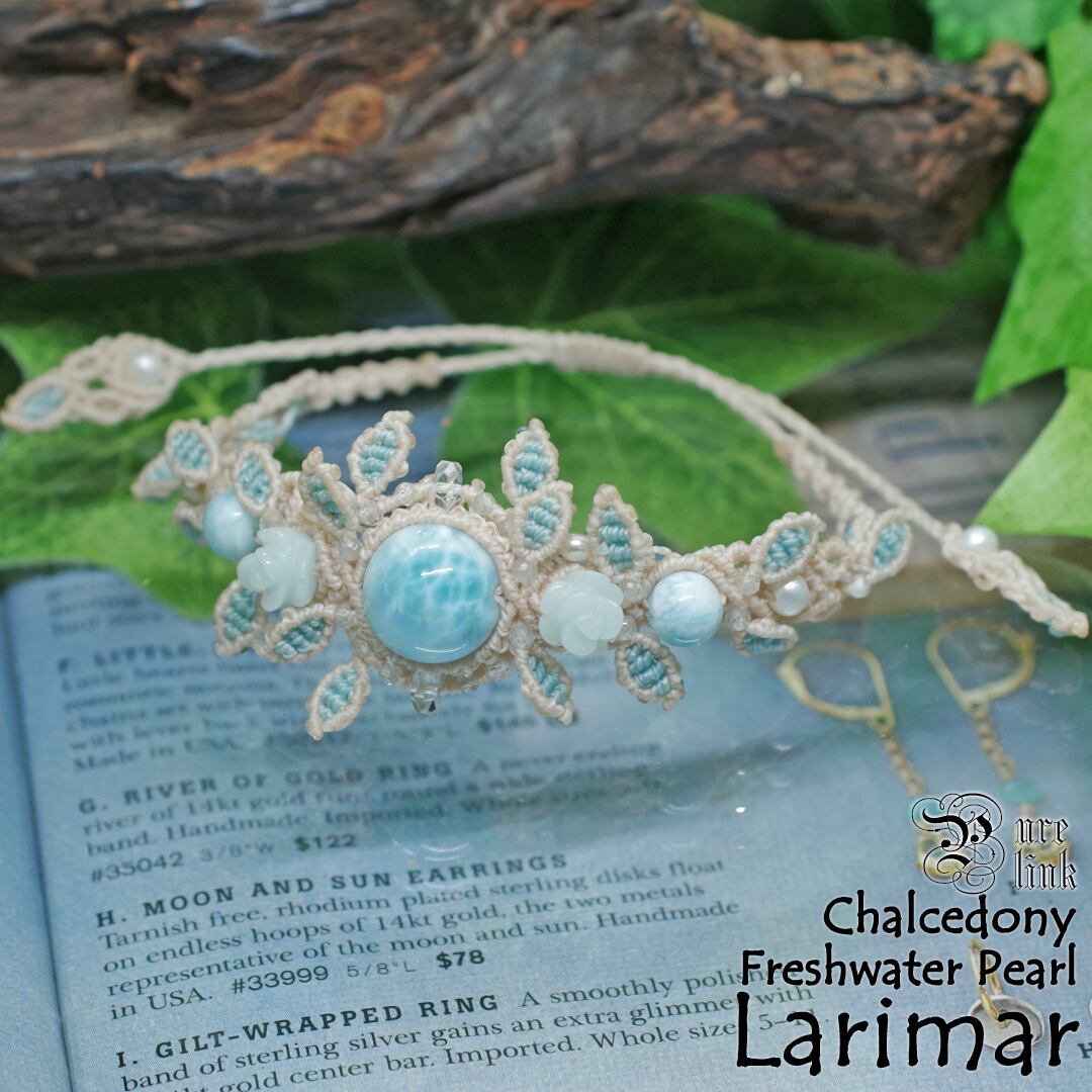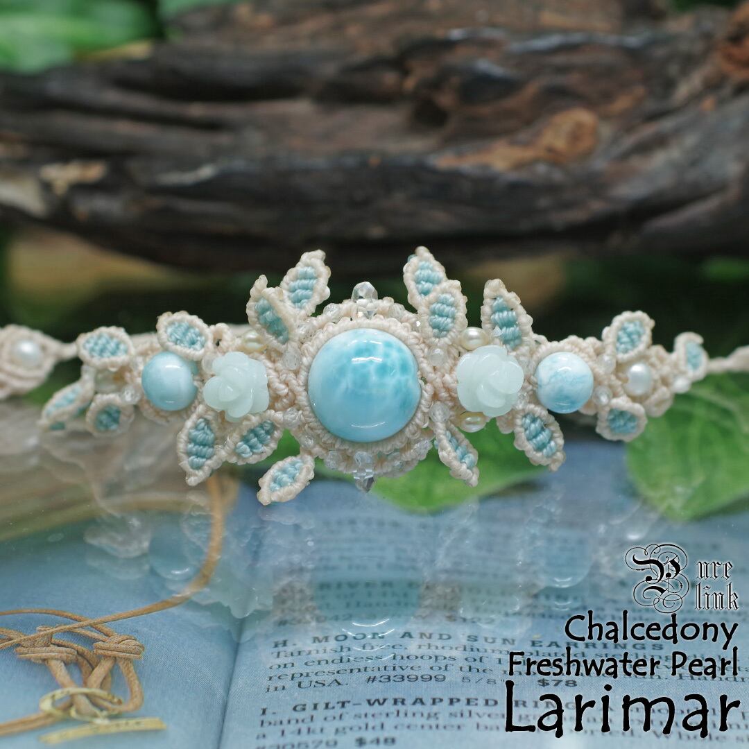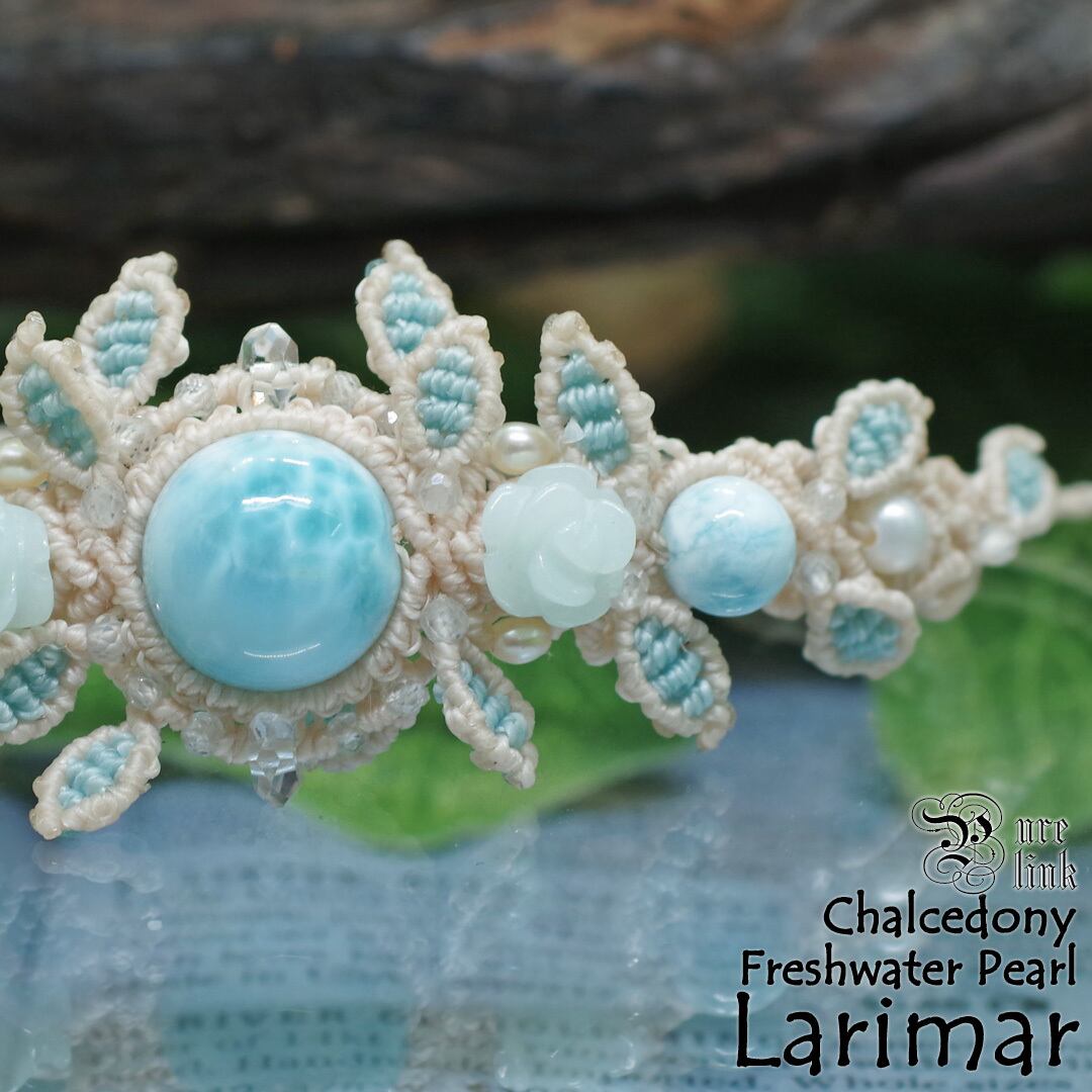 澄んだカリブの海を思わせる『ラリマー』を中心に、やわらかな青薔薇彫の『ブルークォーツァイト』、上品な艶を放つ淡水パールをあしらった、存在感あるマクラメ編みブレスレットです。