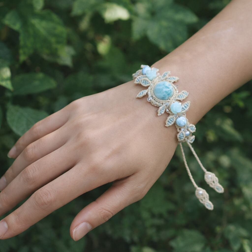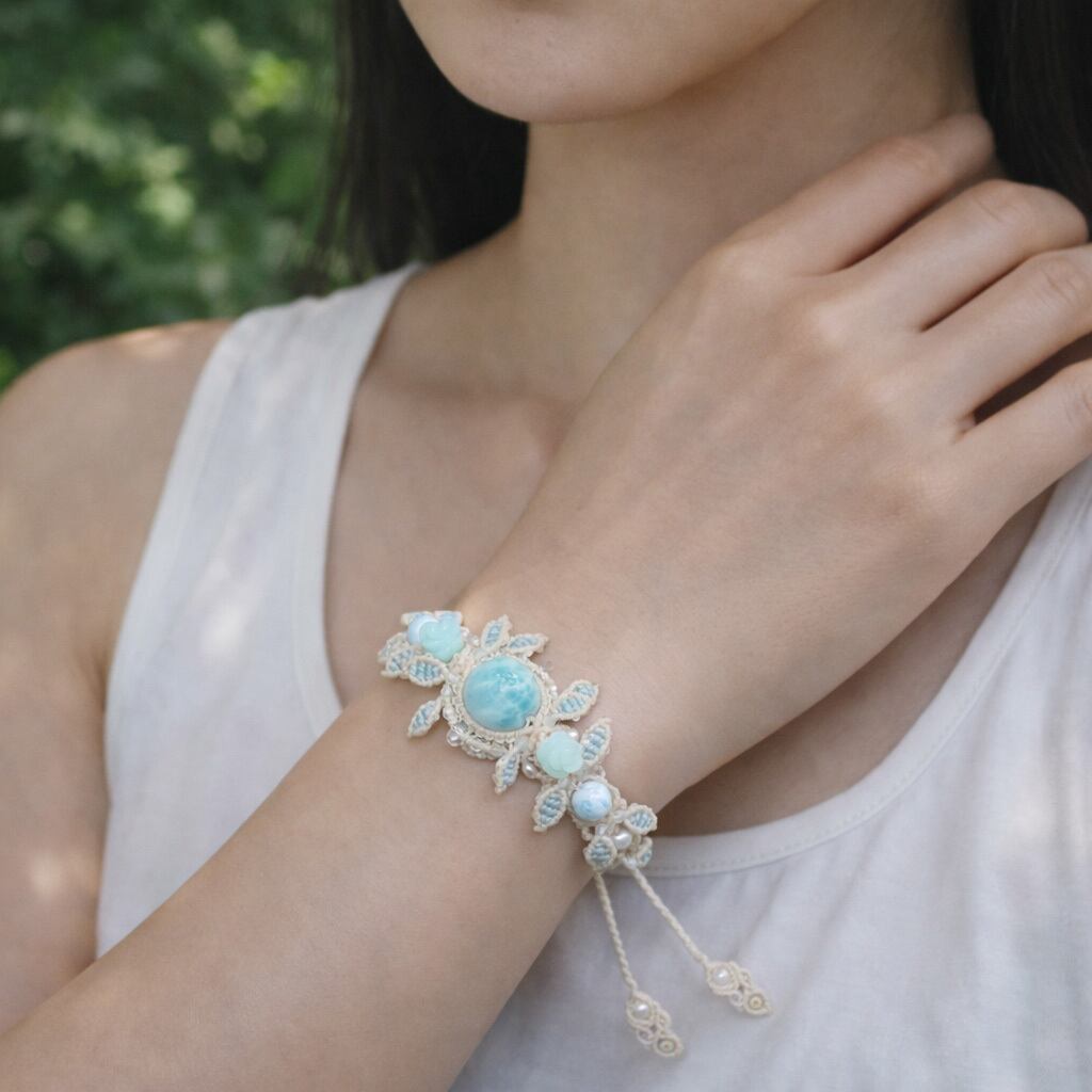 中央の13mm玉ラリマーを主役に、「生命の樹(Tree of Life)」をイメージしたデザインで丁寧に編み上げました。葉を広げるような立体的な装飾は、手首を優しく包み込み、角度によってさまざまな表情を見せてくれます。