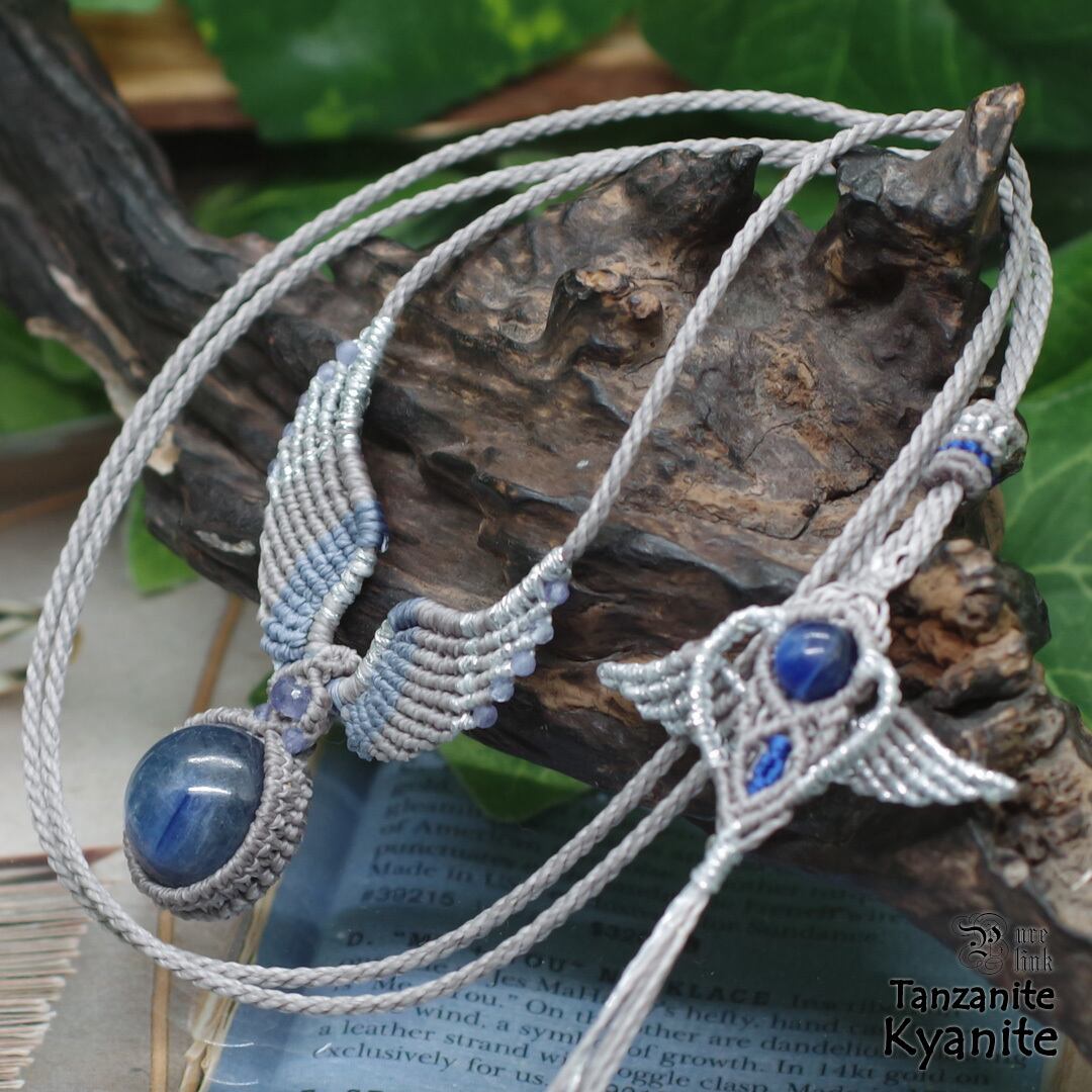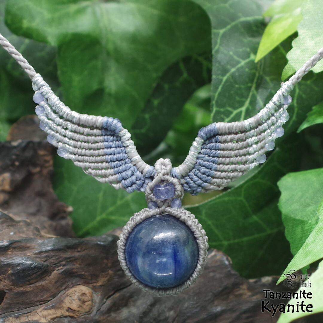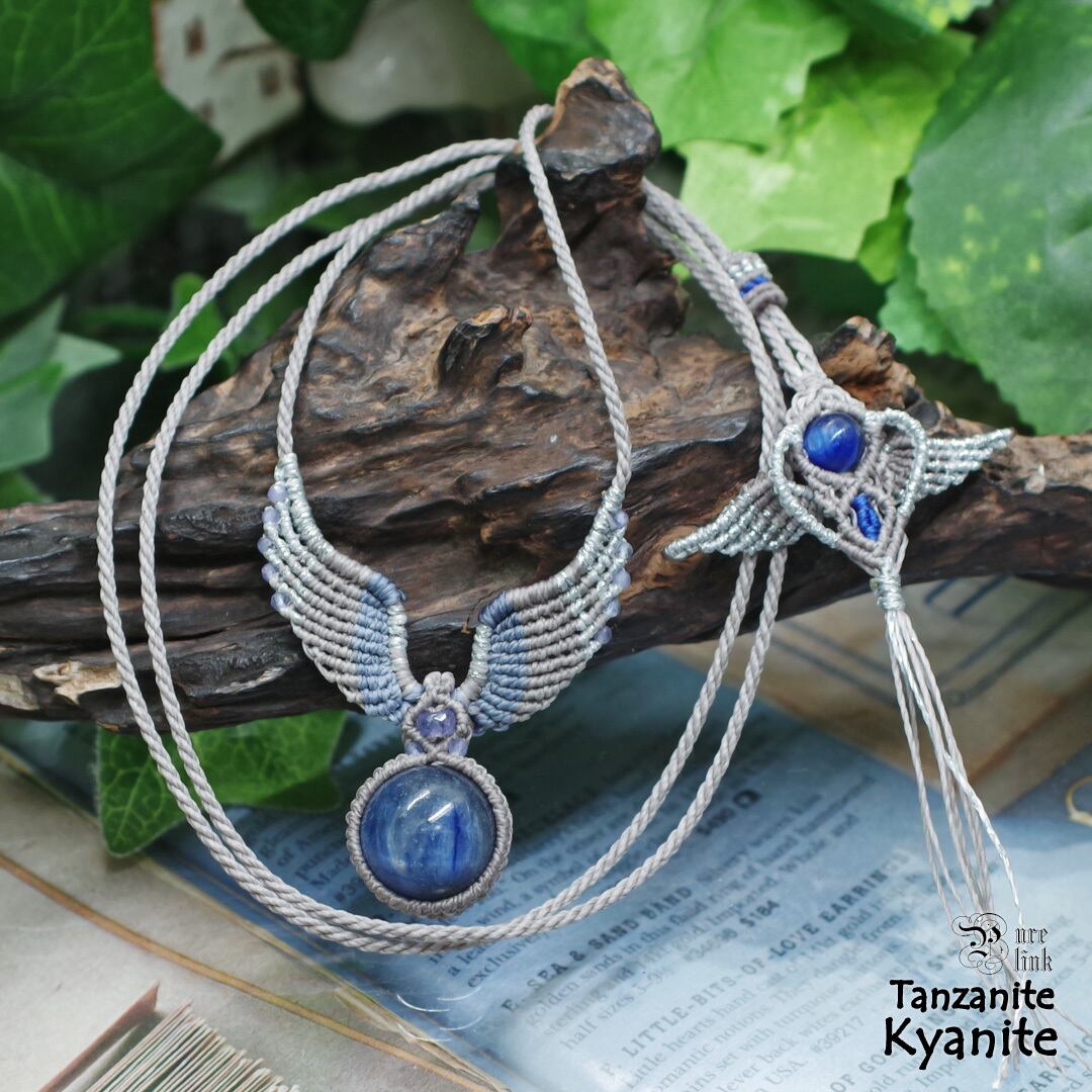 そんな、『カヤナイト』や希少な『タンザナイト』を使用して丁寧に羽・翼をモチーフに編み込み、ただのアクセサリーではなく頼もしいお守りにもなるように、願いを込めて作成した、マクラメ編みトップネックレスです。