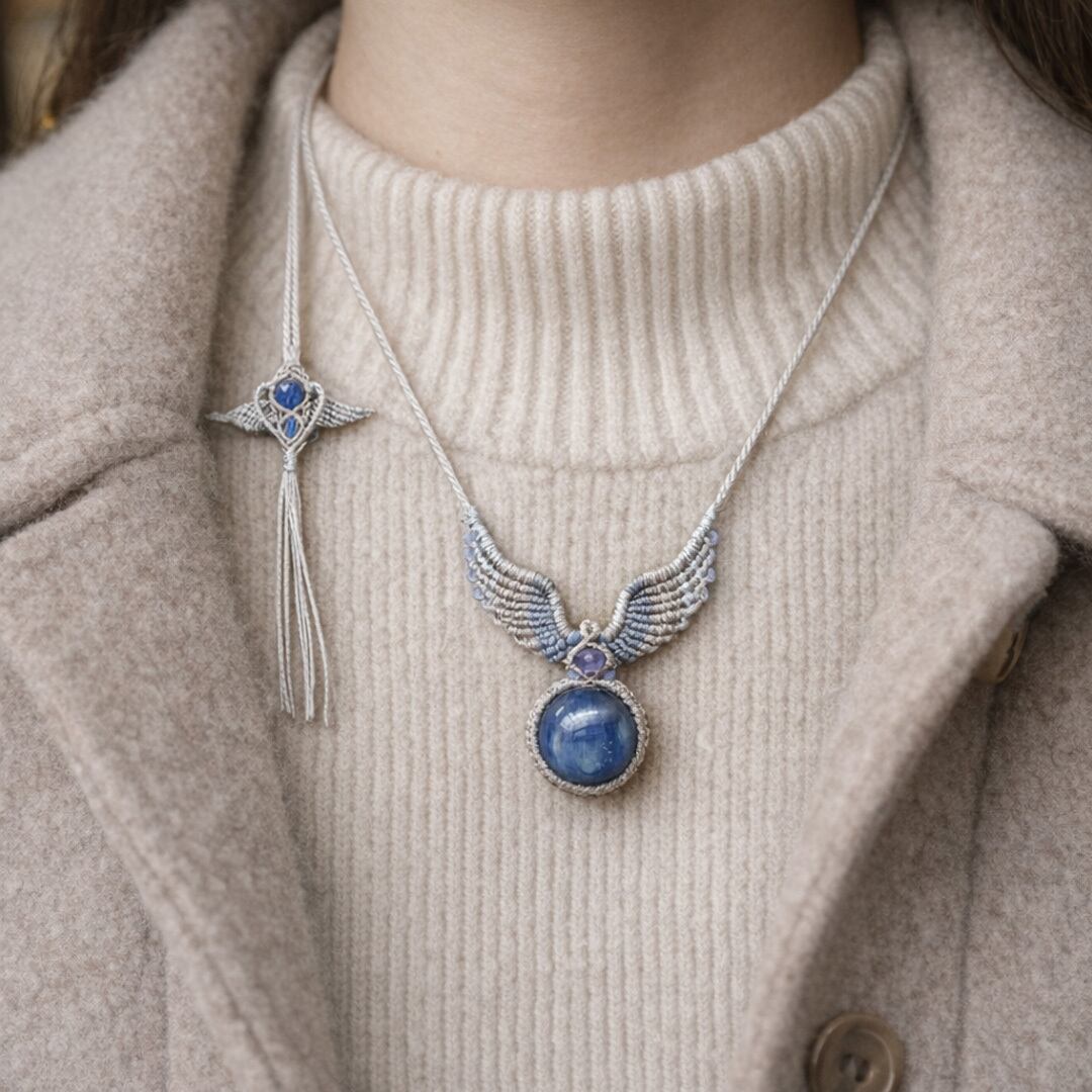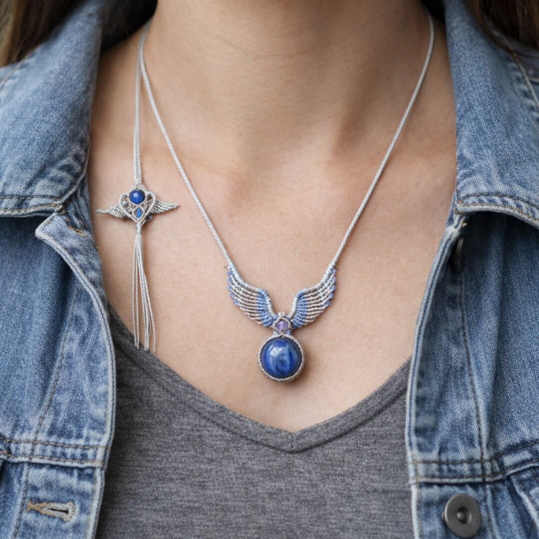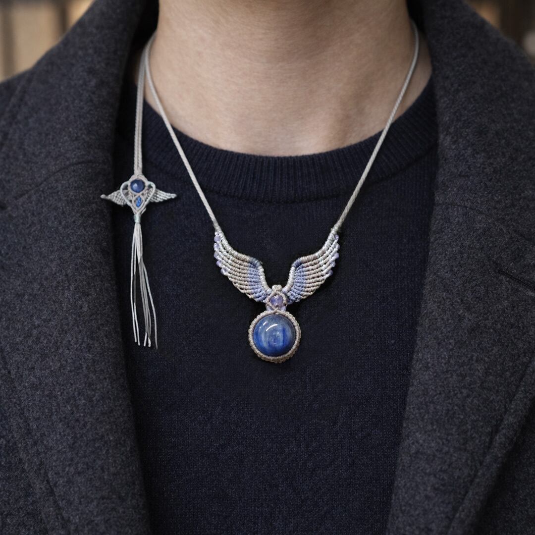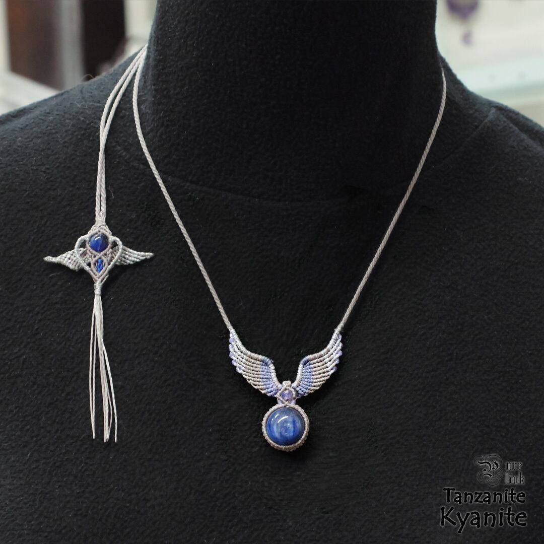 そんな、『カヤナイト』や希少な『タンザナイト』を使用して丁寧に羽・翼をモチーフに編み込み、ただのアクセサリーではなく頼もしいお守りにもなるように、願いを込めて作成した、マクラメ編みトップネックレスです。