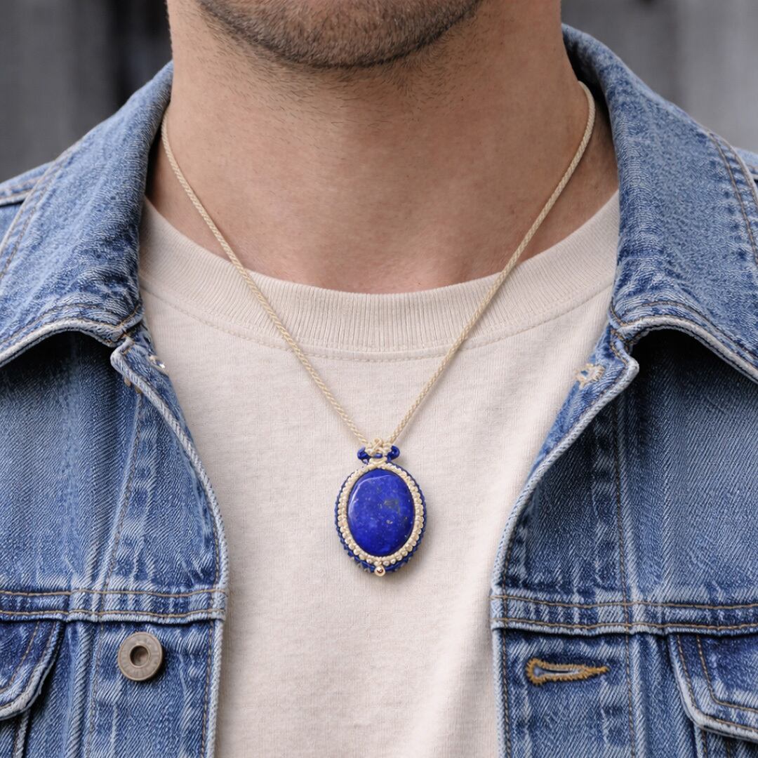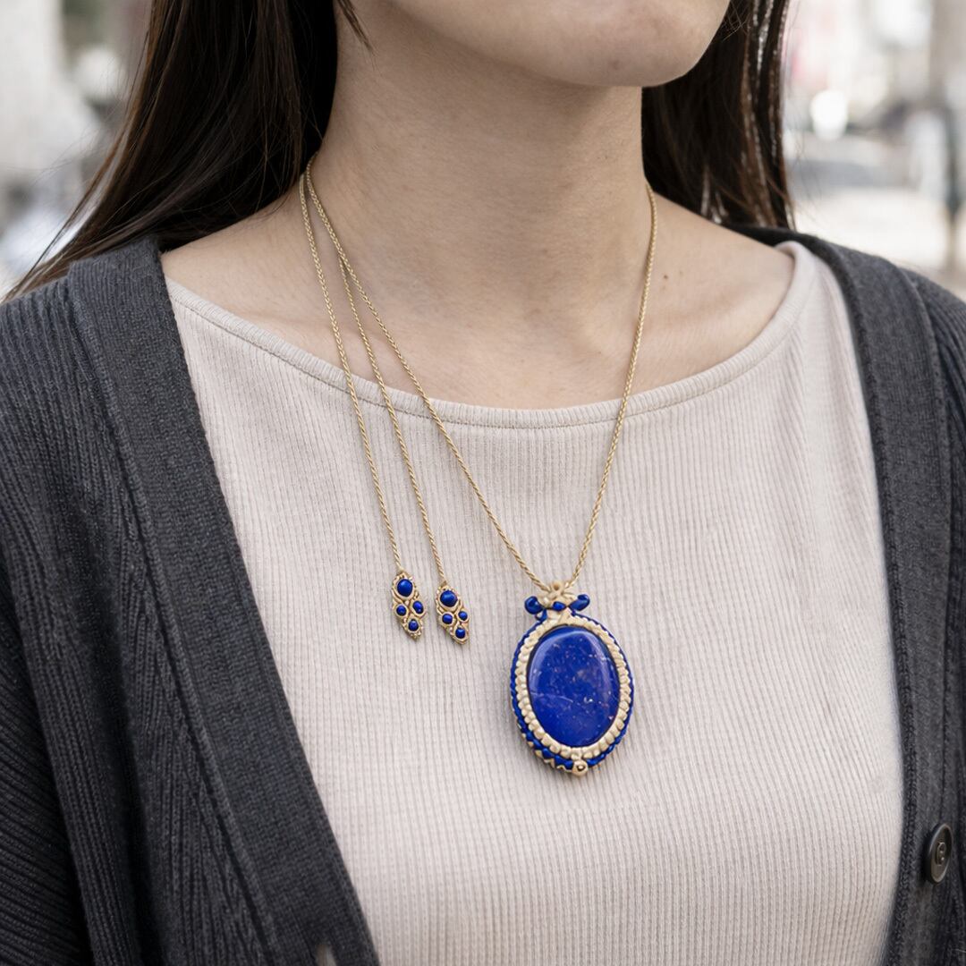 そんな、『ラピスラズリ』を使用して、丁寧に編み込み、手間暇心を込めて作成したオリジナルのハンドトップネックレスです。