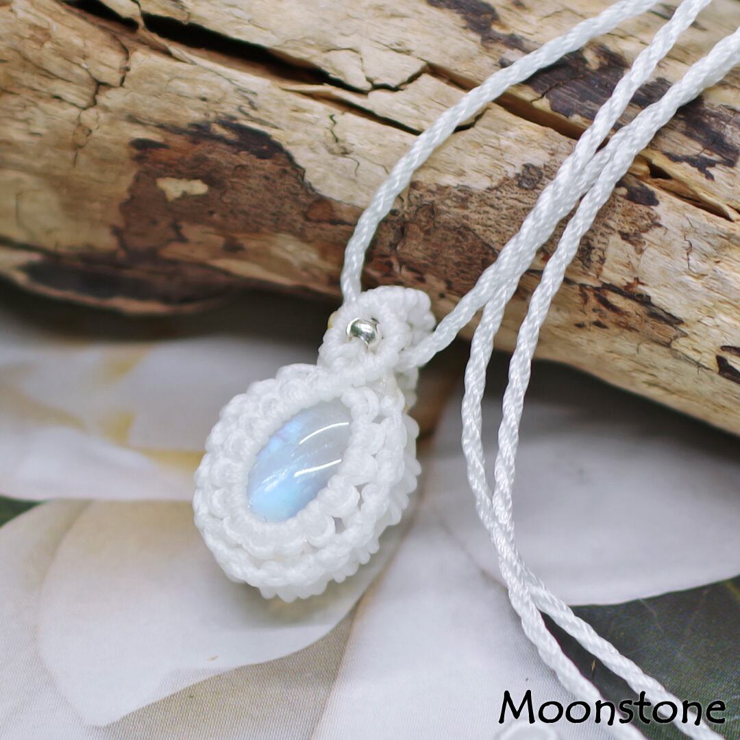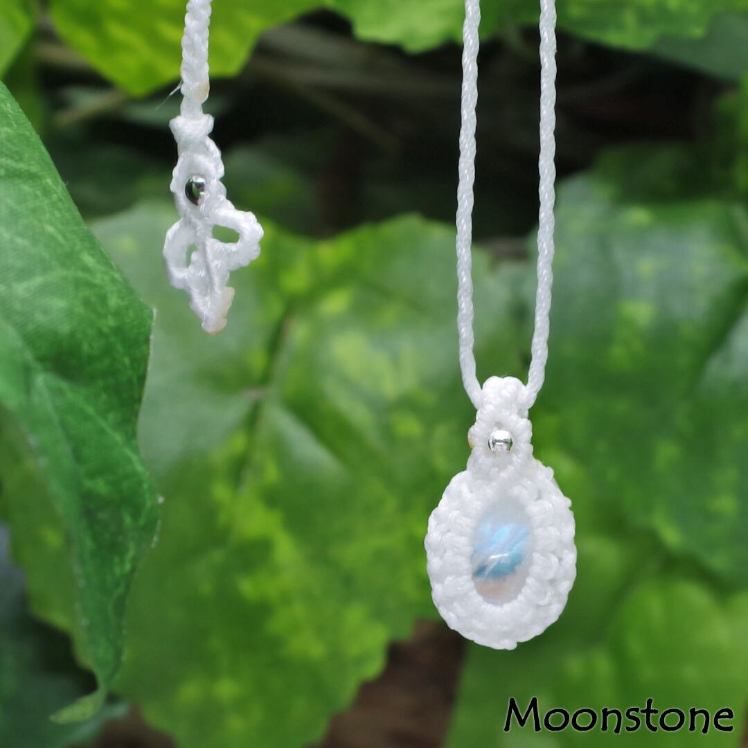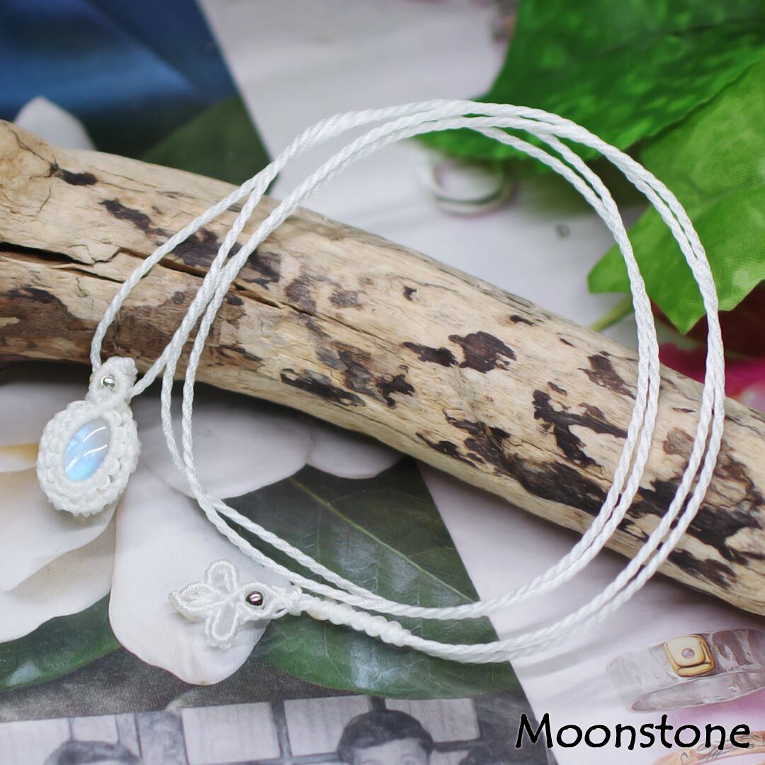そんな、美しく幻想的な輝きを見せてくれる『ロイヤルブルームーンストーン』を使用して、丁寧に手編みで編んで可愛く、さらに紐をスライドすることによりサイズ調整もできちゃう、手間暇、心を込めて作成した、安価な輸入品・大量生産品には負けない1点物のオリジナルハンドメイドネックレスです。
