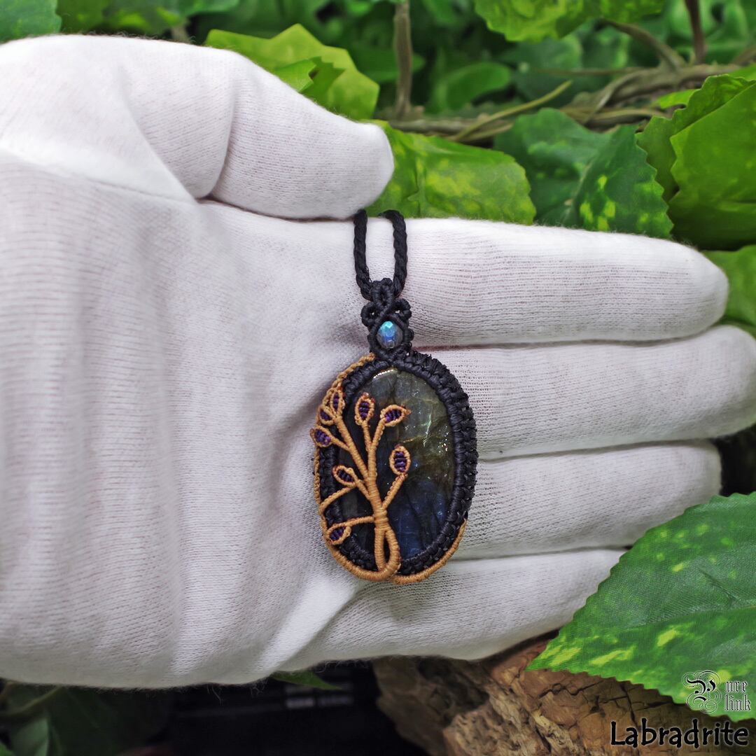 金青色光『ラブラドライト』生命の樹マクラメ編トップネックレス