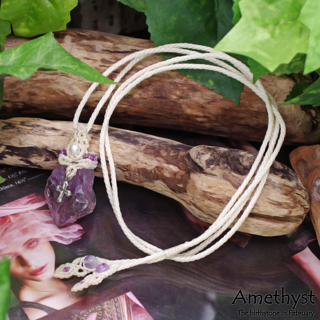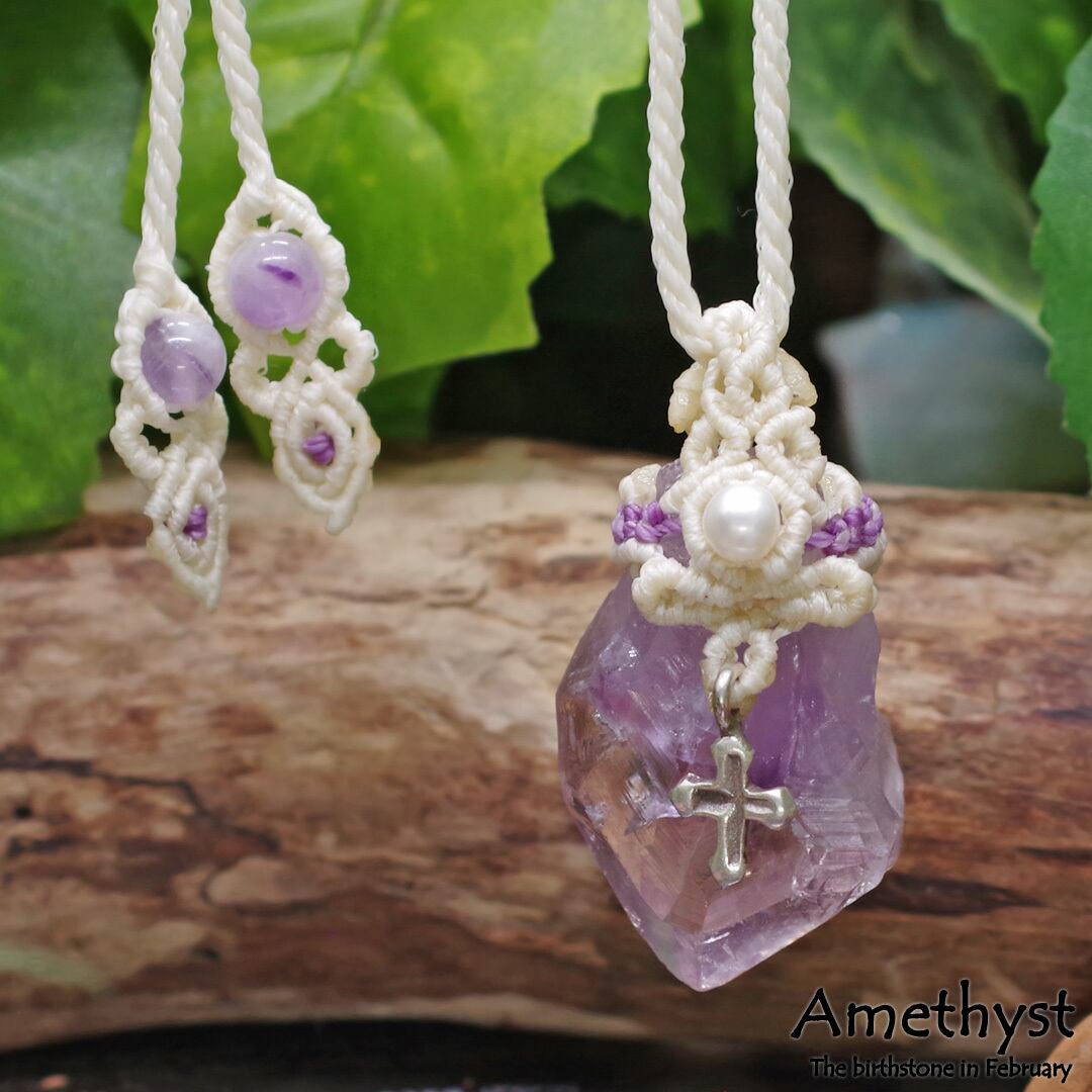 聖なる紫石『アメジスト』人魚の涙『パール』シルバー925十字架マクラメ編トップネックレス