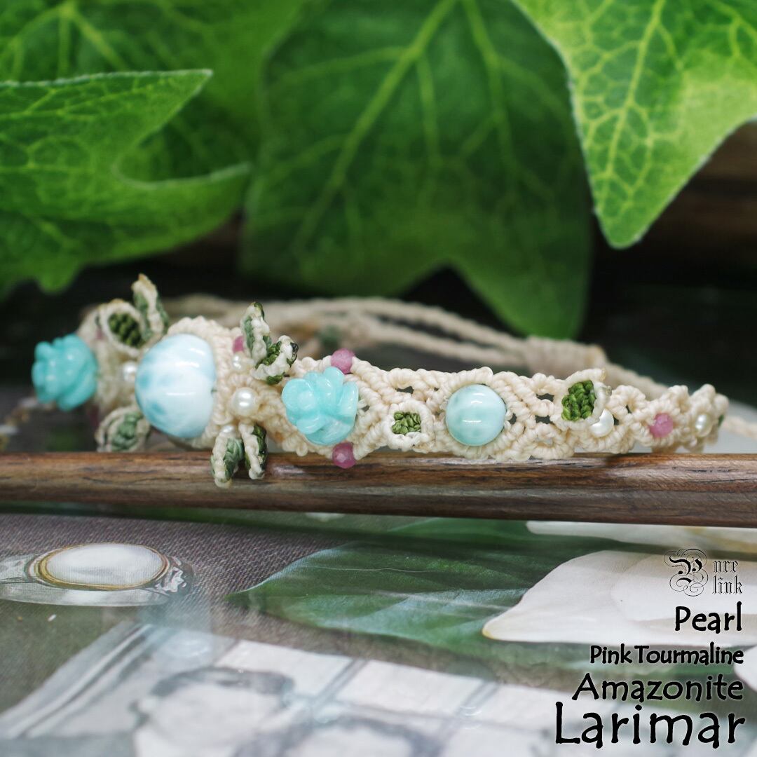 使用しているのは、中央には丸玉の『ラリマー』愛を象徴する花『薔薇』の形に彫刻された『アマゾナイト』と恋の宝石『パール』愛情を育む魔石『ピンクトルマリン』も使用しエデンの園の中央に植えられた木『Tree of Life/生命の樹』をイメージして、見た目だけでなく頼もしいお守りにもなるように、願いを込め丁寧に編んで作成した、サイズ調整も可能な当ショップオリジナルのハンドメイドマクラメ編ブレスレットです。