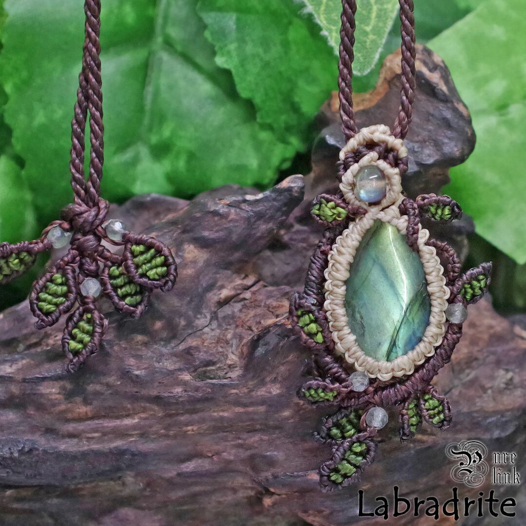 そんな、幻想的な輝きを放つ『ラブラドライト』を使用し、より石達の力が発揮できるように願いを込め丁寧に編んで作成した、当ショップオリジナルのハンドメイドマクラメ編ネックレスです。