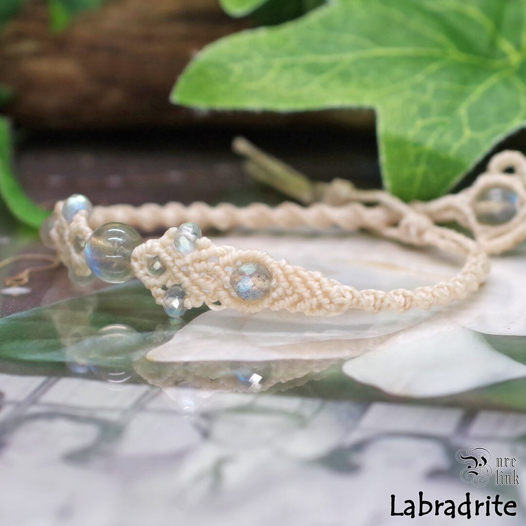 そんな美しい選別した高品質の『ラブラドライト』を使用して、見た目だけでなく頼もしいお守りにもなるように丁寧に編んで作成したマクラメ編ブレスレットです。