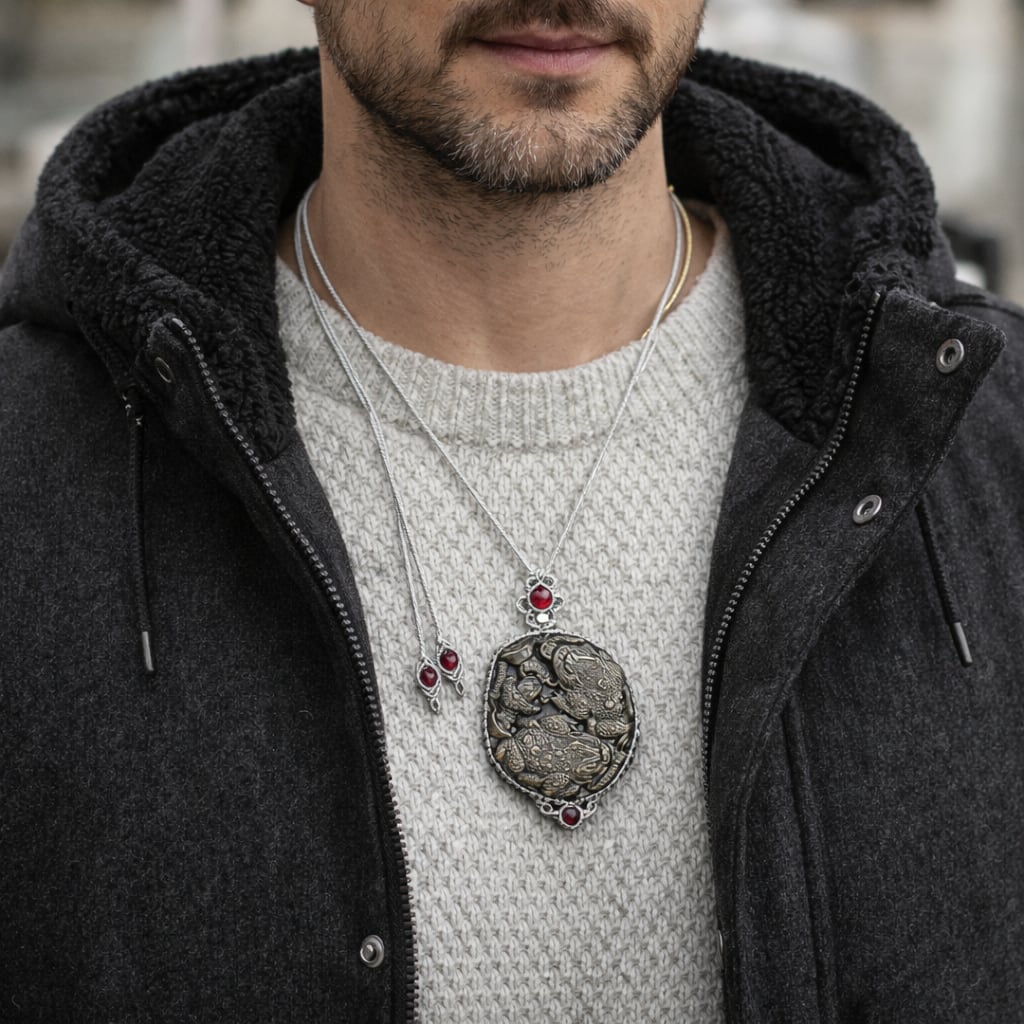 そんな、『銭蛙』彫り『ゴールデンオブシディアン』と『ガーネット』や虹色に輝く『プレシャスオパール』も使用して、見た目だけでなく頼もしいお守りにもなるように丁寧に編んで作成したマクラメ編ネックレスです。