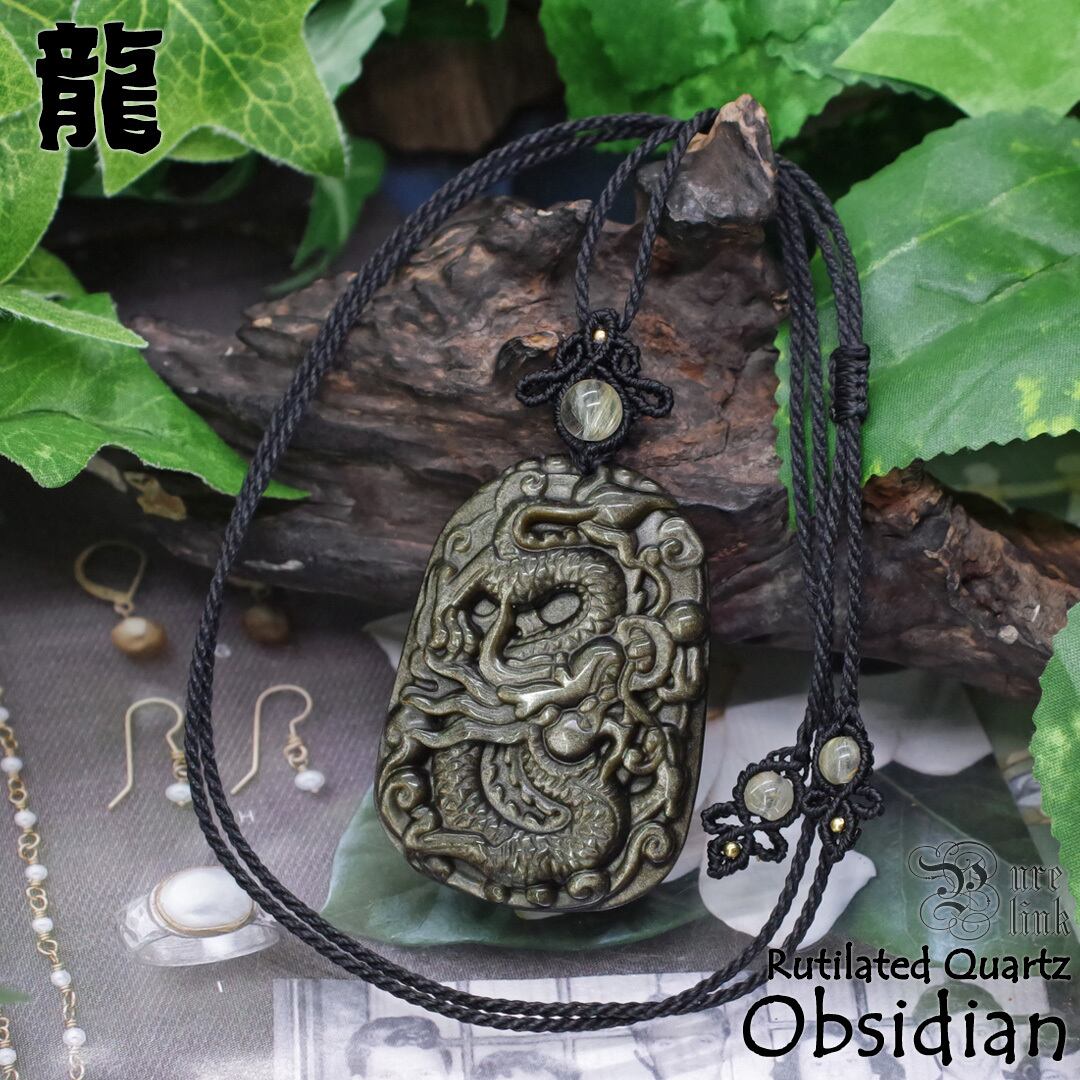 そんな、『龍』彫り『ゴールデンオブシディアン』と『ルチルクォーツ』も使用して、見た目だけでなく頼もしいお守りにもなるように丁寧に編んで作成したマクラメ編ネックレスです。