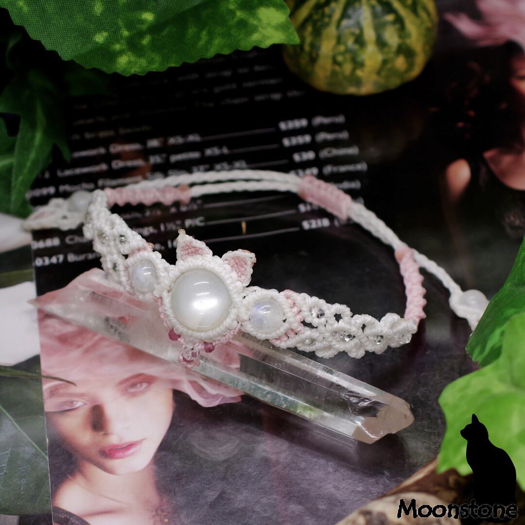 と…そんな『ムーンストーン』と小粒の『ピンクトルマリン』や『水晶』も使用し、ただのアクセサリーではなく、頼もしいお守りにもなるように、願いを込め丁寧に編んで作成した、サイズ調整も可能な当ショップオリジナルのハンドメイドマクラメ編「猫耳」付きブレスレットです。