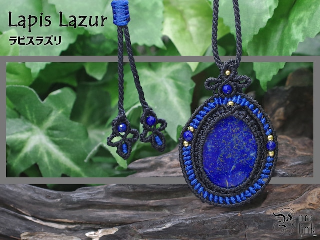 なお、穴の開いていない希少で大きな20mm玉の『ラピスラズリ』を上下左右自由に回転できるように包み込にマクラメ編みで編み込んでいます。