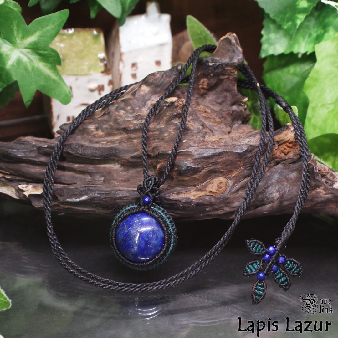 なお、穴の開いていない希少で大きな20mm玉の『ラピスラズリ』を上下左右自由に回転できるように包み込にマクラメ編みで編み込んでいます。