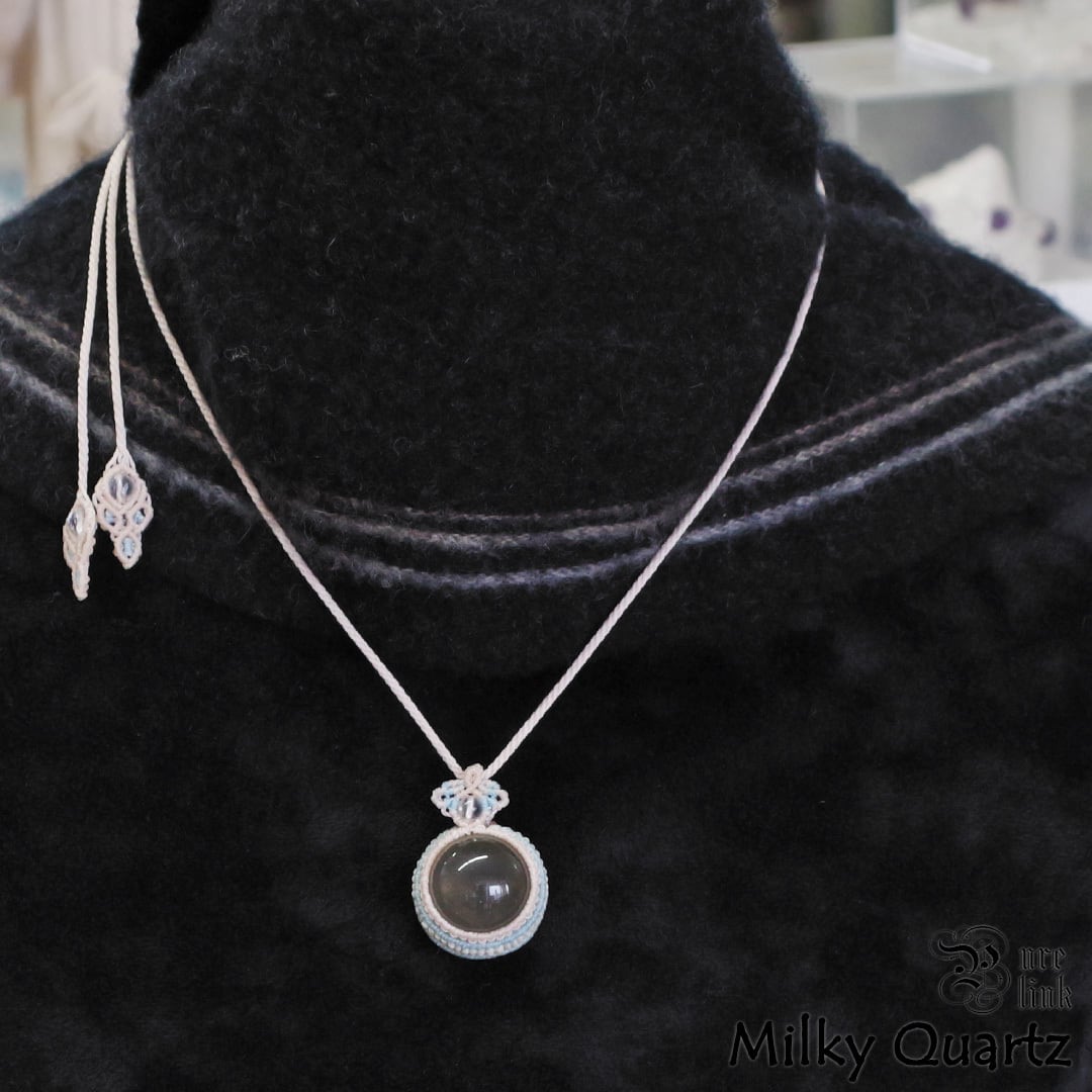 なお、穴の開いていない『ミルキークォーツ』を上下左右自由に回転できるように包み込にマクラメ編みで編み込んでいます。