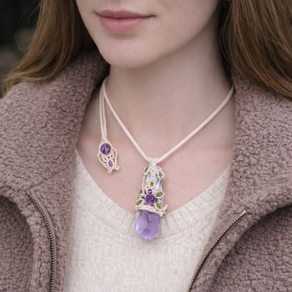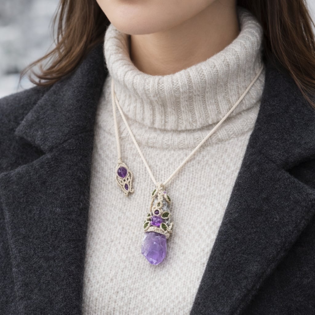 聖なる紫石『アメジスト』ダガーポイント・紫薔薇マクラメ編ネックレス